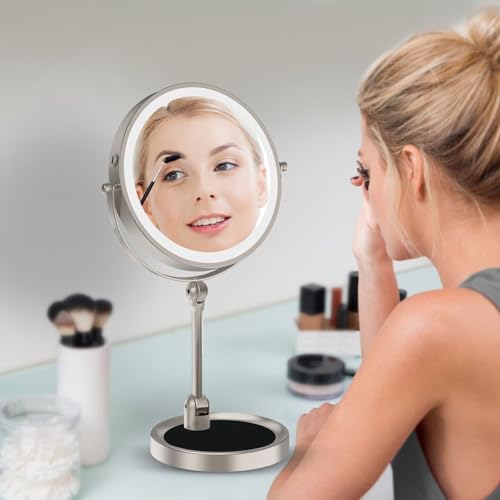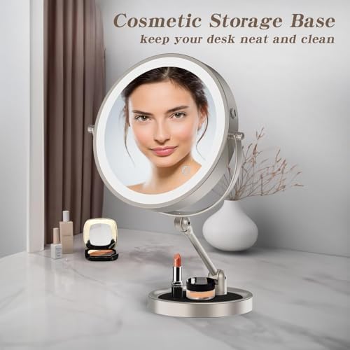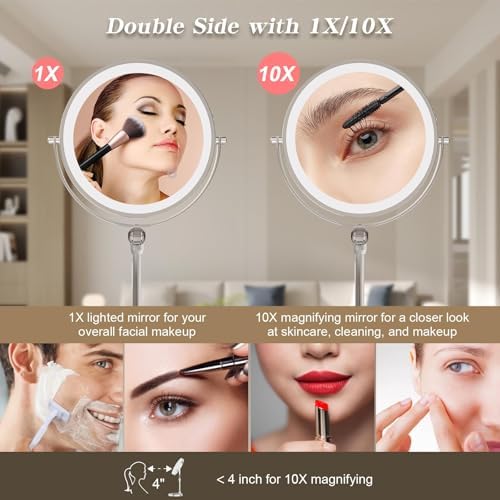 9" Large Lighted Makeup Mirror with 1X/10X Magnification, 4000mAh Rechargeable Vanity Mirror with Height Adjustable & 3 Color Dimmable Lights, 360°Swivel Double Sided Tabletop Cosmetic Mirror