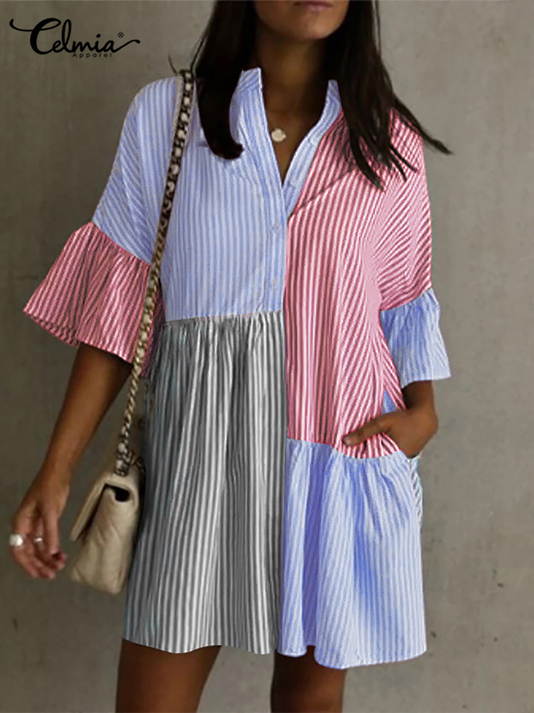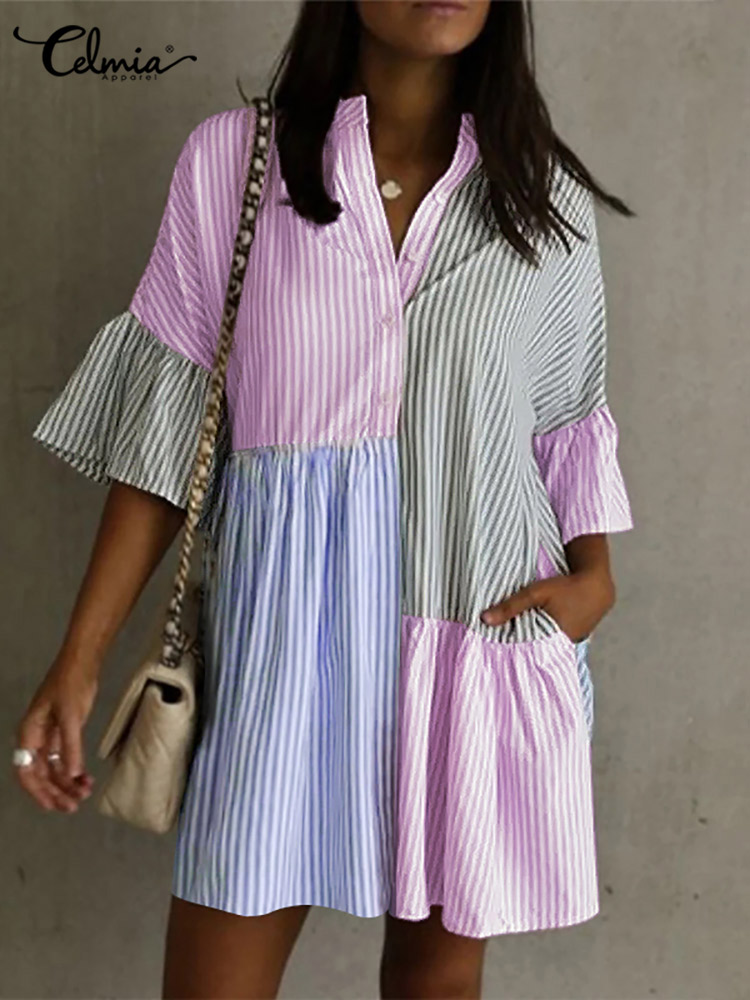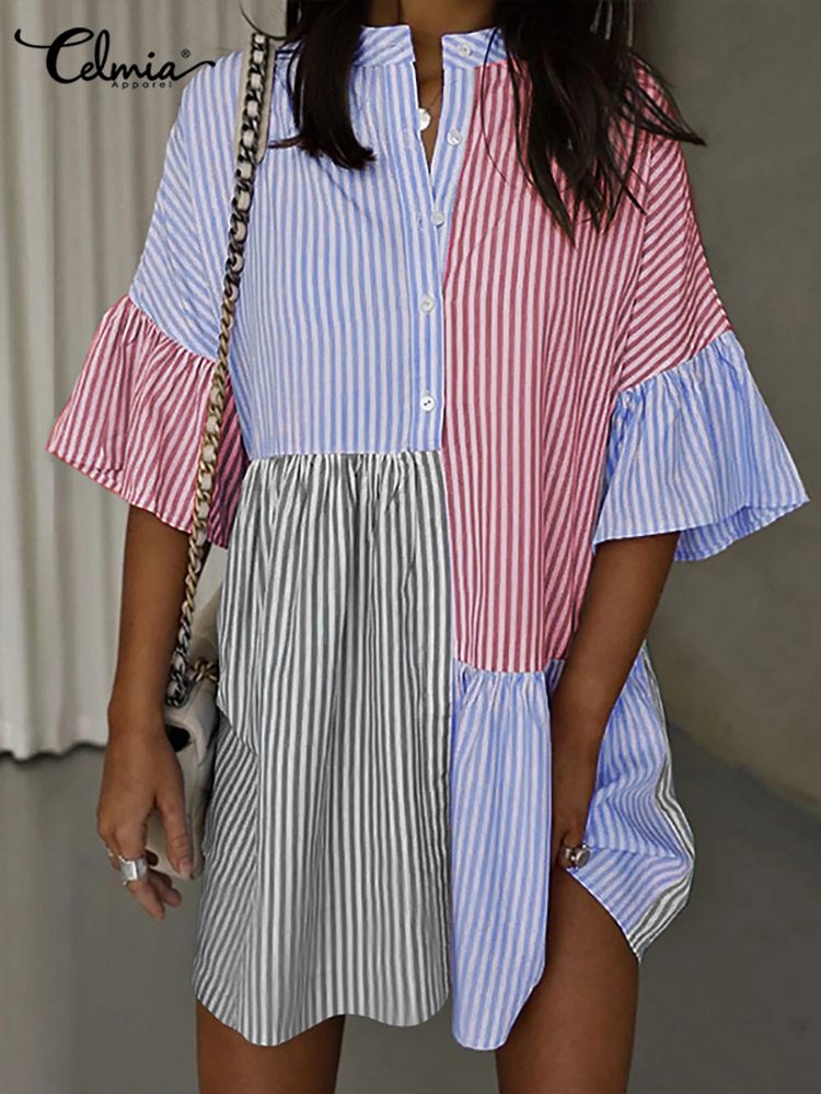 Celmia Stripe Patchwork Flare Half Sleeve Mini Dress Summer Elegant Casual Loose Buttons Short Sundress Women Shirt Dress