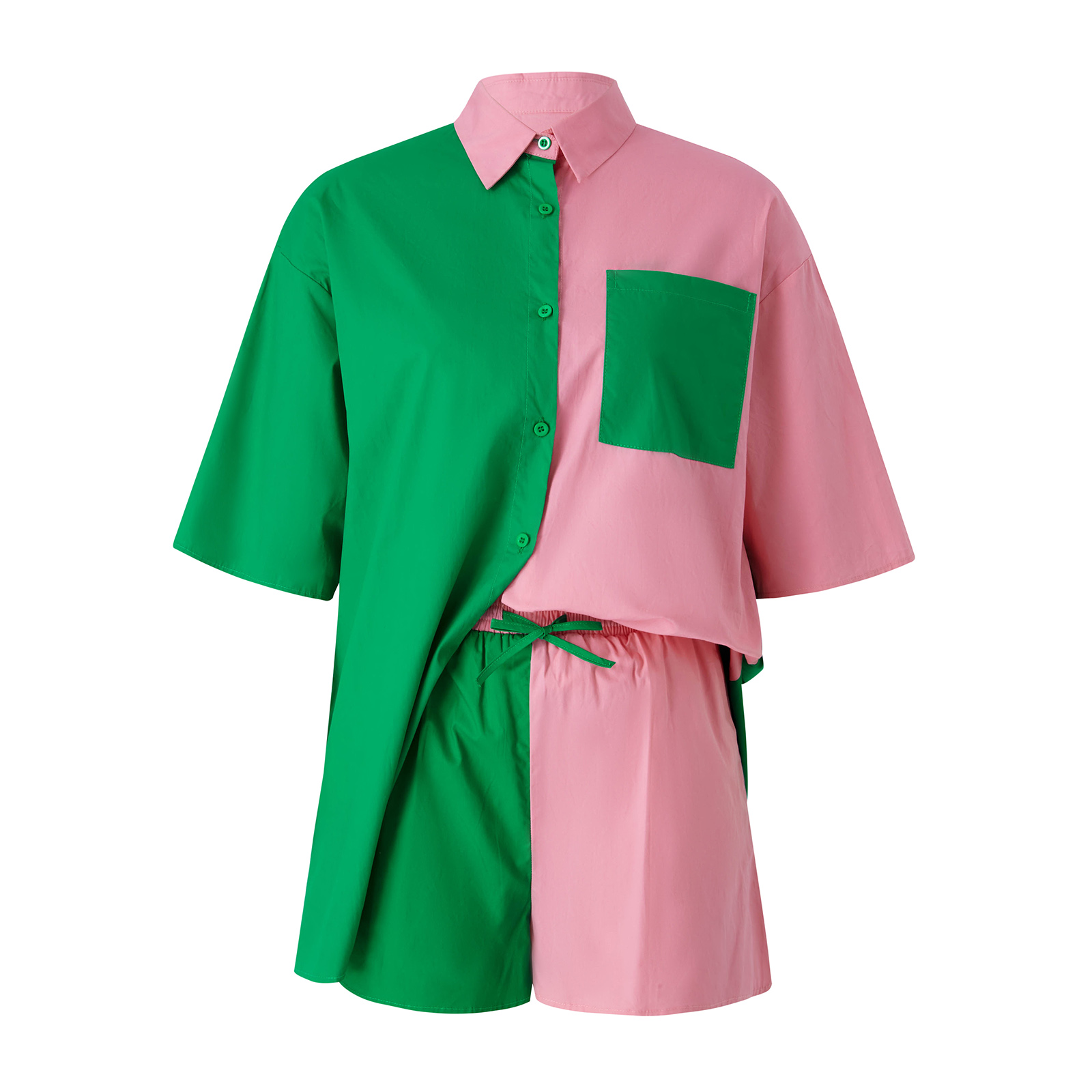 Women Solid Color Clothes Set, Half Sleeve Lapel Neck Button-up Shirt+Irregular Hem Drawstring Shorts