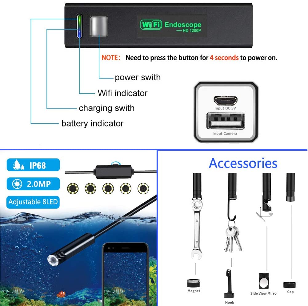 2.【Unique LED technology】:8 adjustable blue LED light on camera tip, it greatly helps to improve image brightness and clarity even in dark or low-light condition .