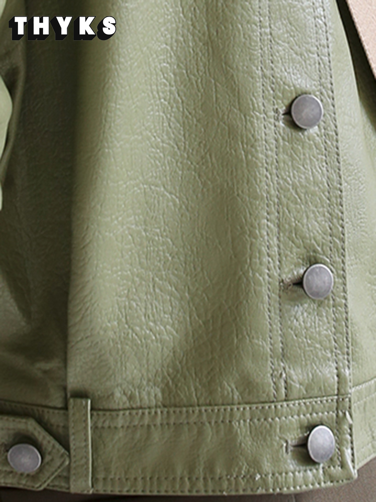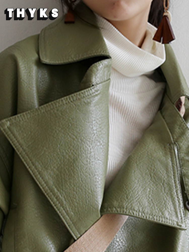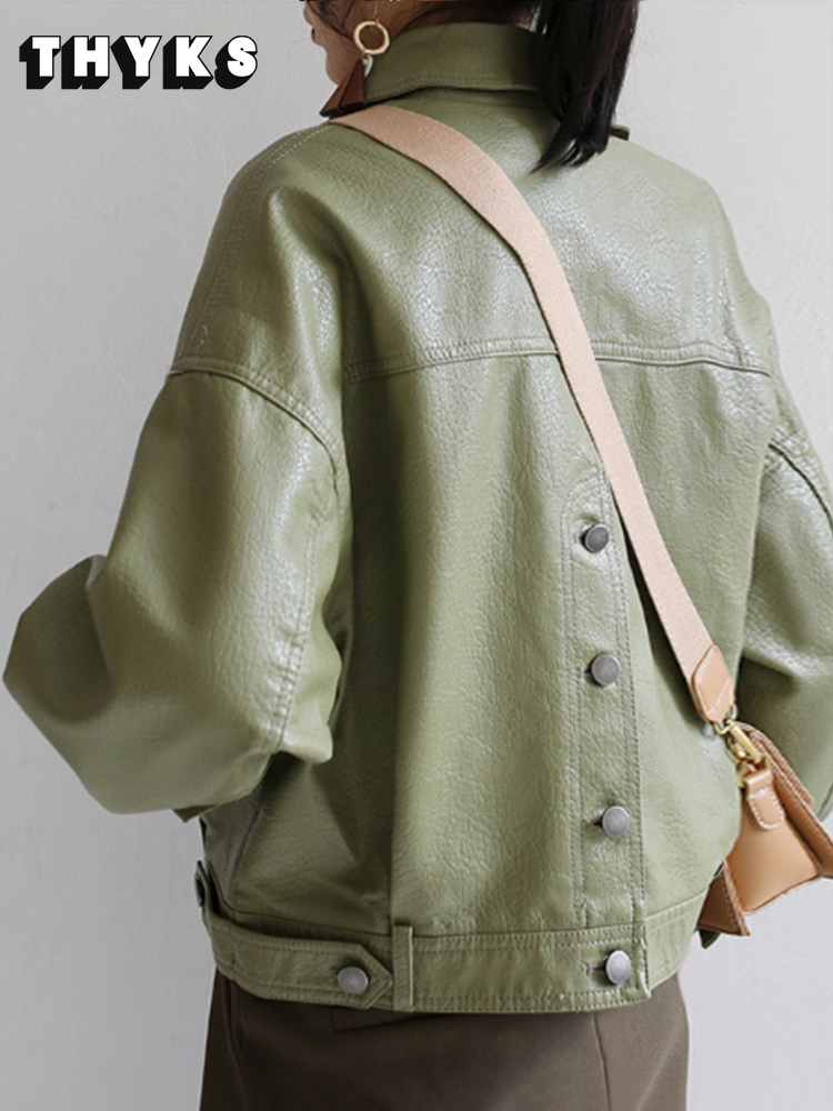 Fall Fashion Green Soft Faux Leather Jacket Ladies Pocket Loose Biker Cropped Jacket High Quality Designer Clothing 2022