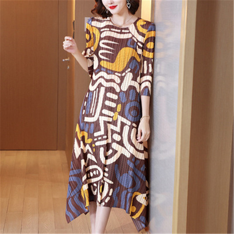 French printed dress autumn Miyake folds temperament loose large size women's dress was thin mid-length dress clothing