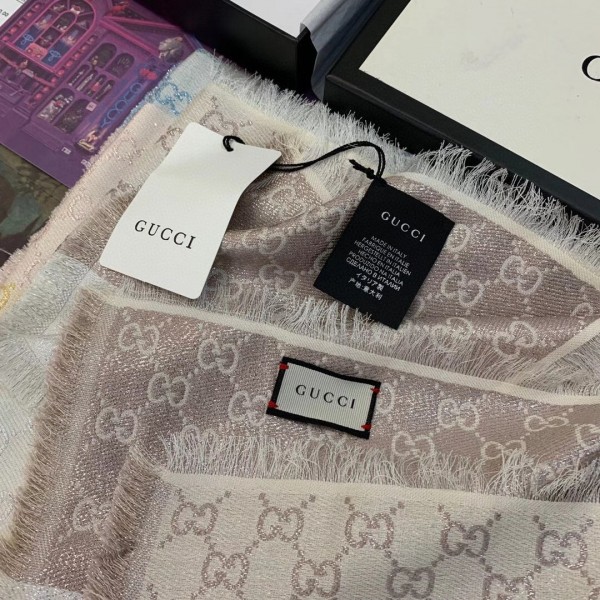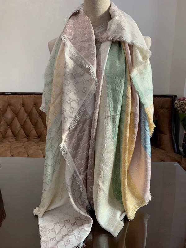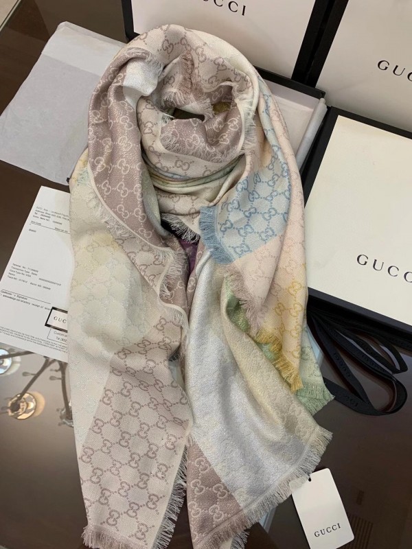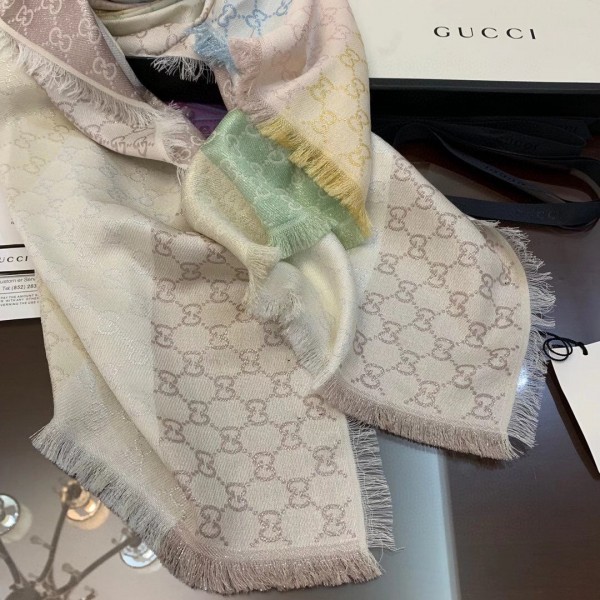 An evolution of the original Gucci rhombi design, the GG logo has become an established symbol of Gucci’s heritage. Integrated within the Cruise 2019 collection, the distinctive pattern is reimagined in combination with a multicolored pastel pattern. It is crafted from a blend of viscose, cotton, silk and wool for an accessory that feels supremely soft to the touch and is lightweight to wear.