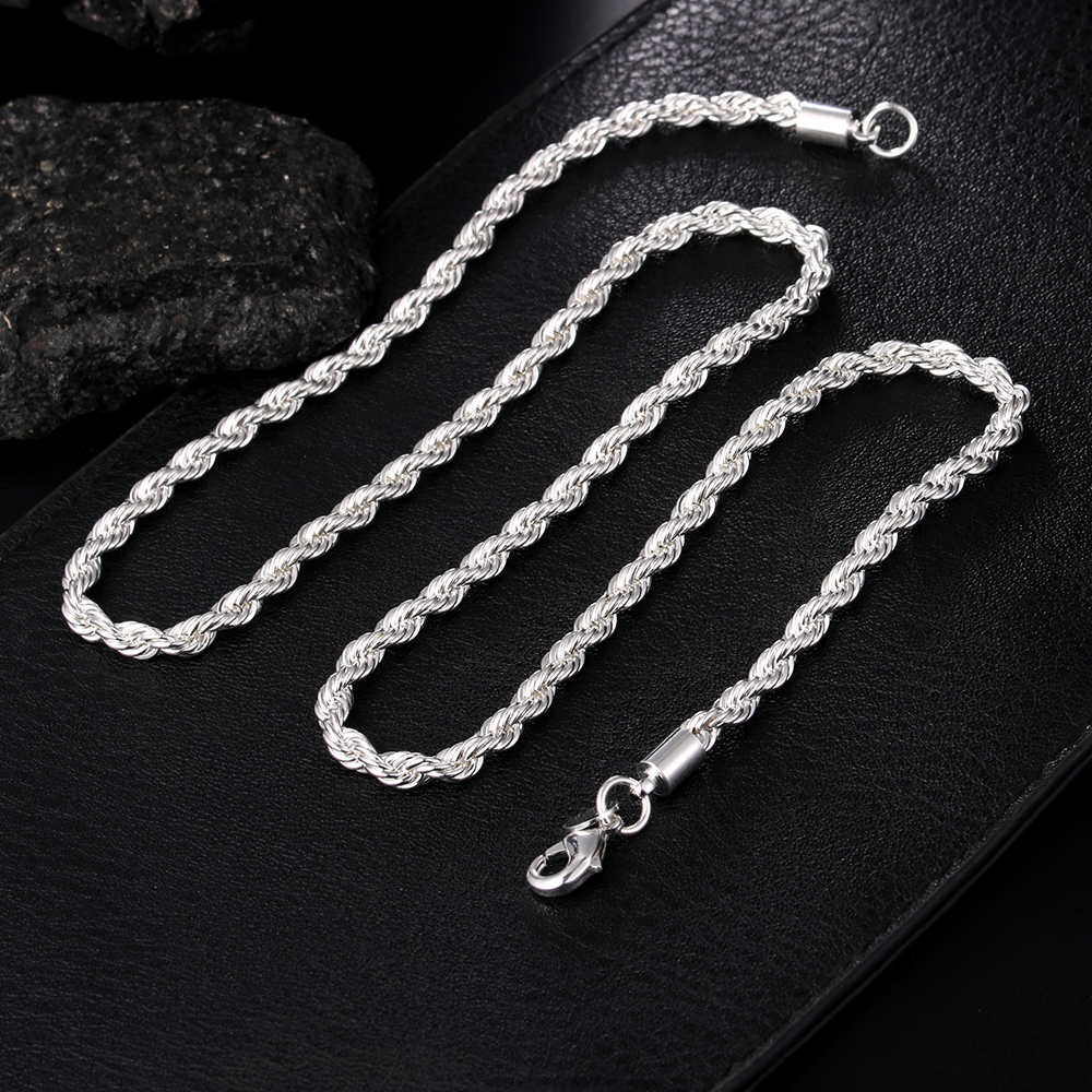 High 925 Sterling Silver 4MM Women Men chain Male Twisted Rope Necklace Bracelets Silver Jewelry Set