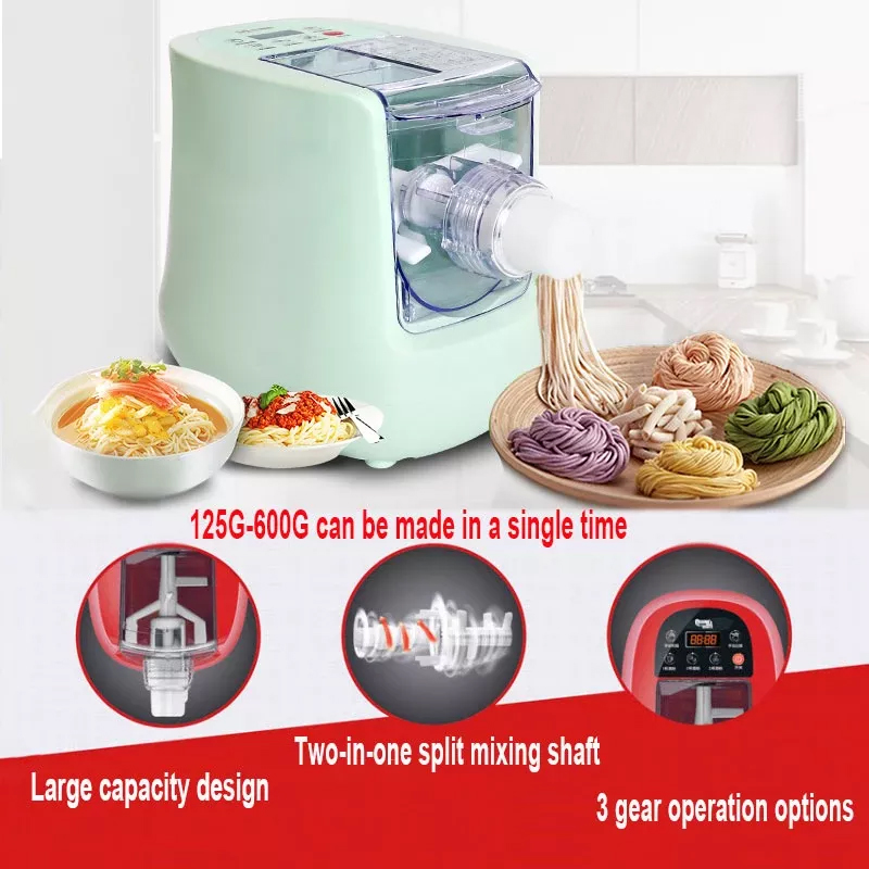 Features: *Multiple knife mold combinations can make wide noodles, narrow noodles, hollow noodles, dragon beard noodles, etc. ; * You can add egg liquid, vegetable juice (soft vegetable leaves can be put directly, hard vegetables must be juiced), etc. to make noodles of different flavors, healthy and delicious; * Simple operation, put the flour into the noodles, easy Get it done; *Food grade material, hygienic, healthy, environmentally friendly, and practical; *Imitate artificial kneading, add appropriate amount of flour, the machine will automatically mix the flour and water; *Excess dough can be easily cleaned by hand, simple and convenient; *Multiple safety protection The device has a long service life.