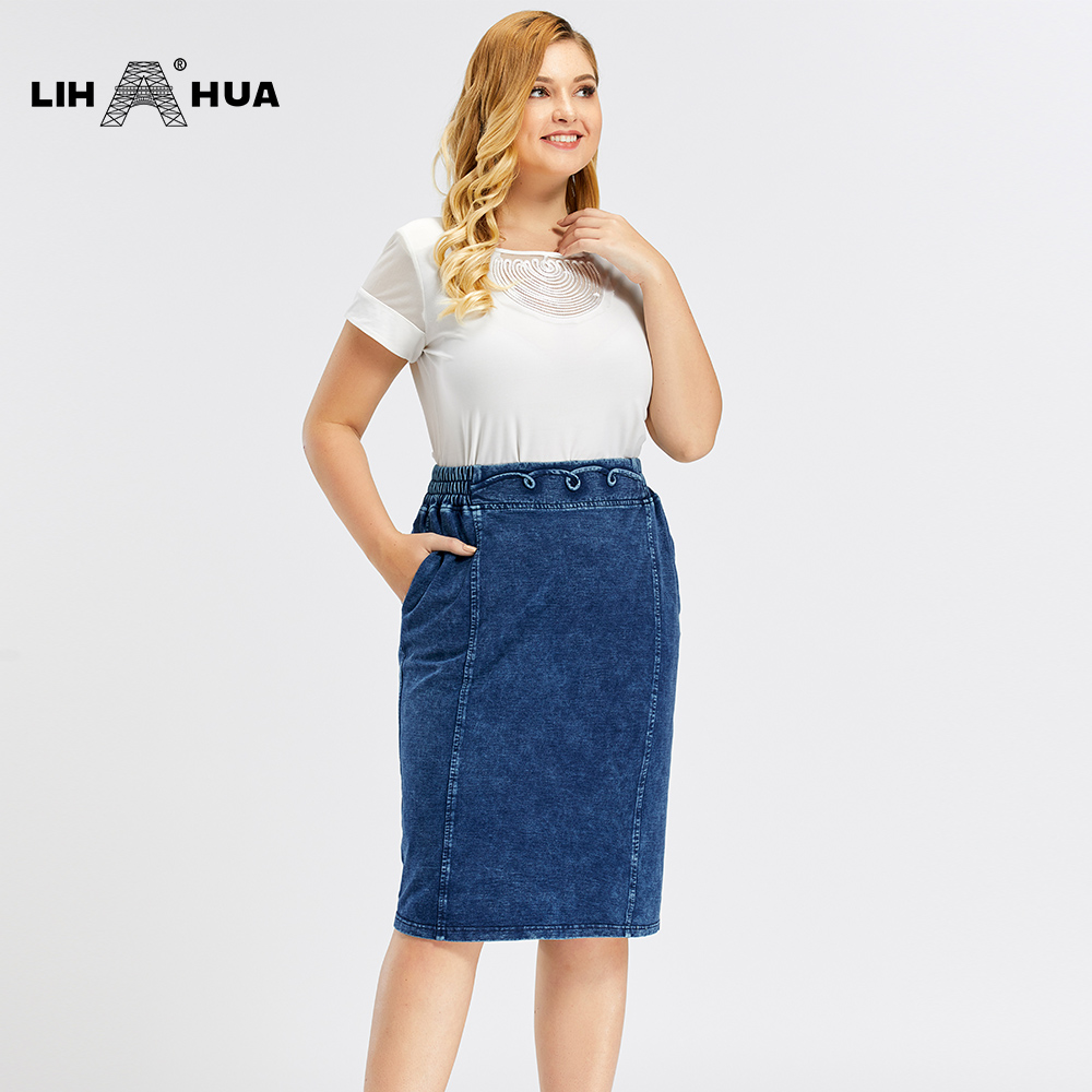 LIH HUA Women's Plus Size Casual Denim Skirt High Flexibility Skirt Knitted Denim