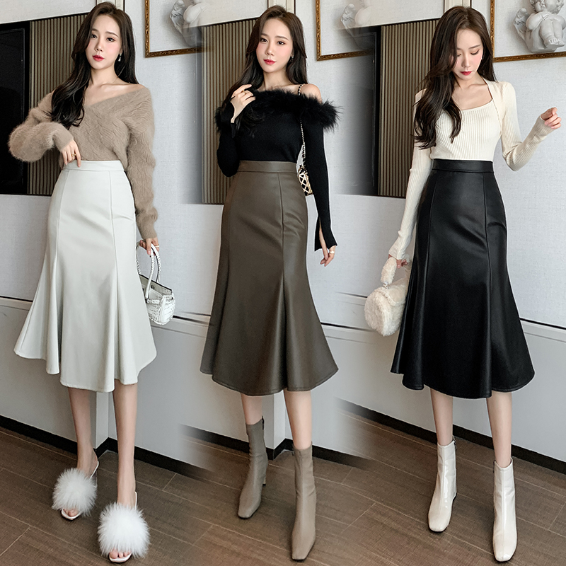 Ladies Elegant Asymmetrical Faux Leather Mermaid Skirt Autumn Winter High Waist Midi Skirt Office Female PU Skirts