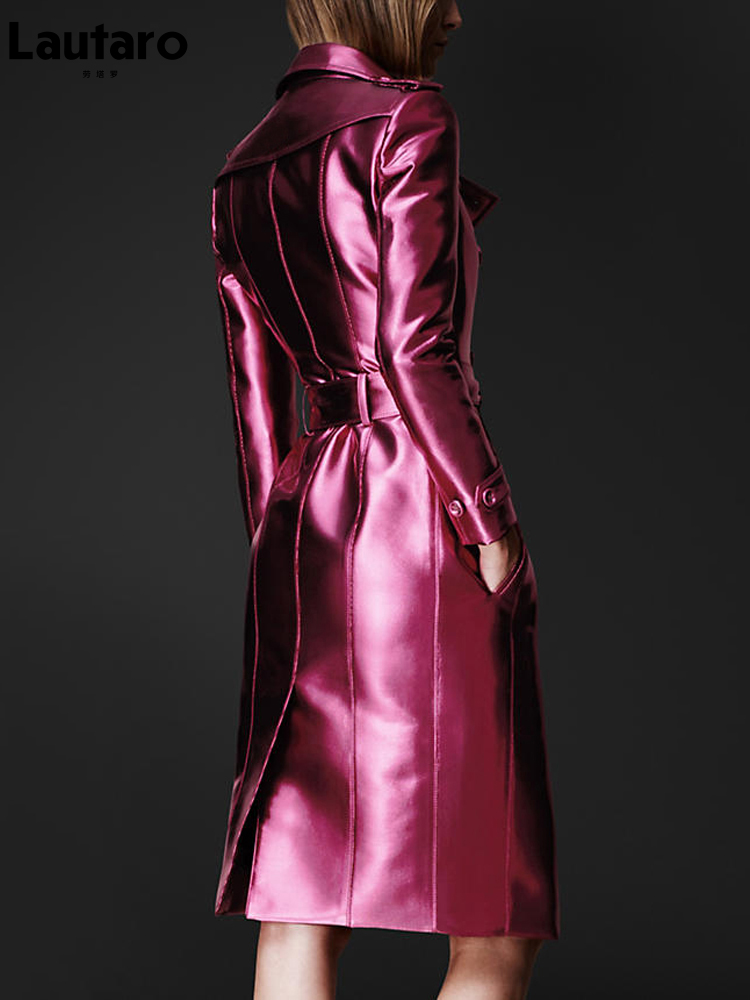 Lautaro Spring Autumn Long Shiny Reflective Patent Leather Trench Coat for Women Belt Double Breasted Cool European