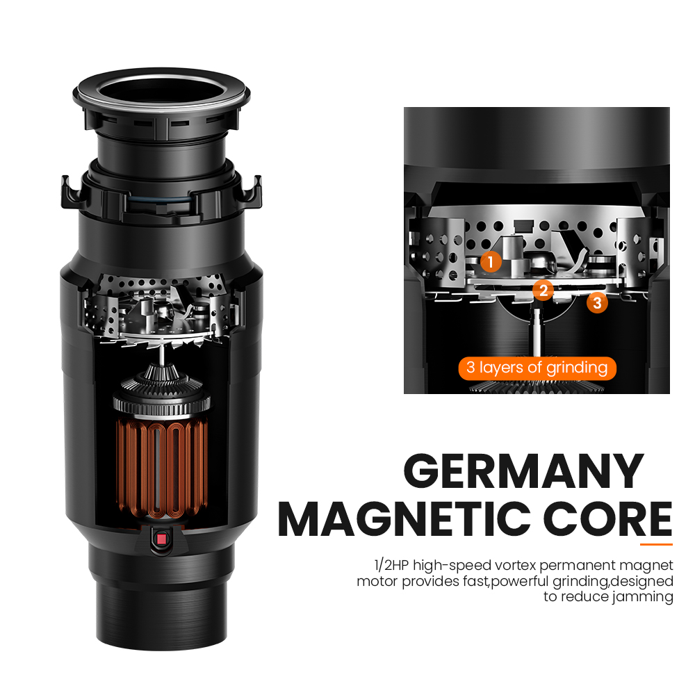 The machine is designed with three layers of grinding technology inside, the first layer is a stainless steel grinding disc that easily knocks up food residues. The second and third layers adopt gear structure, which is to deeply cut the residue debris of the first grinding disc, to guarantee that 100% of the residue flowing into the sewer becomes fluid substance and 100% avoid the problem of water pipe blockage.