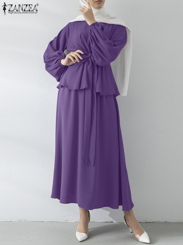 Muslim Sets Women Autumn Matching Sets ZANZEA Puff Sleeve Bllouses A-Skirts Female Marocain Turkish Tops Islam Clothing