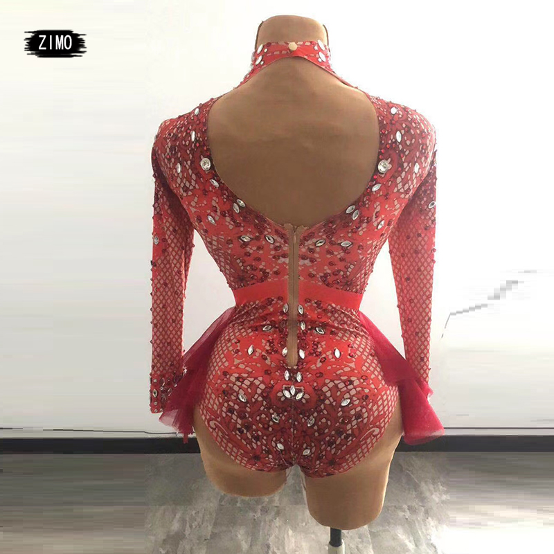 Rhinestone pink Ruffles Bodysuit Womens Big Stretch nightclub Prom Bar concert outfits Stage Singer Show dance Leotard