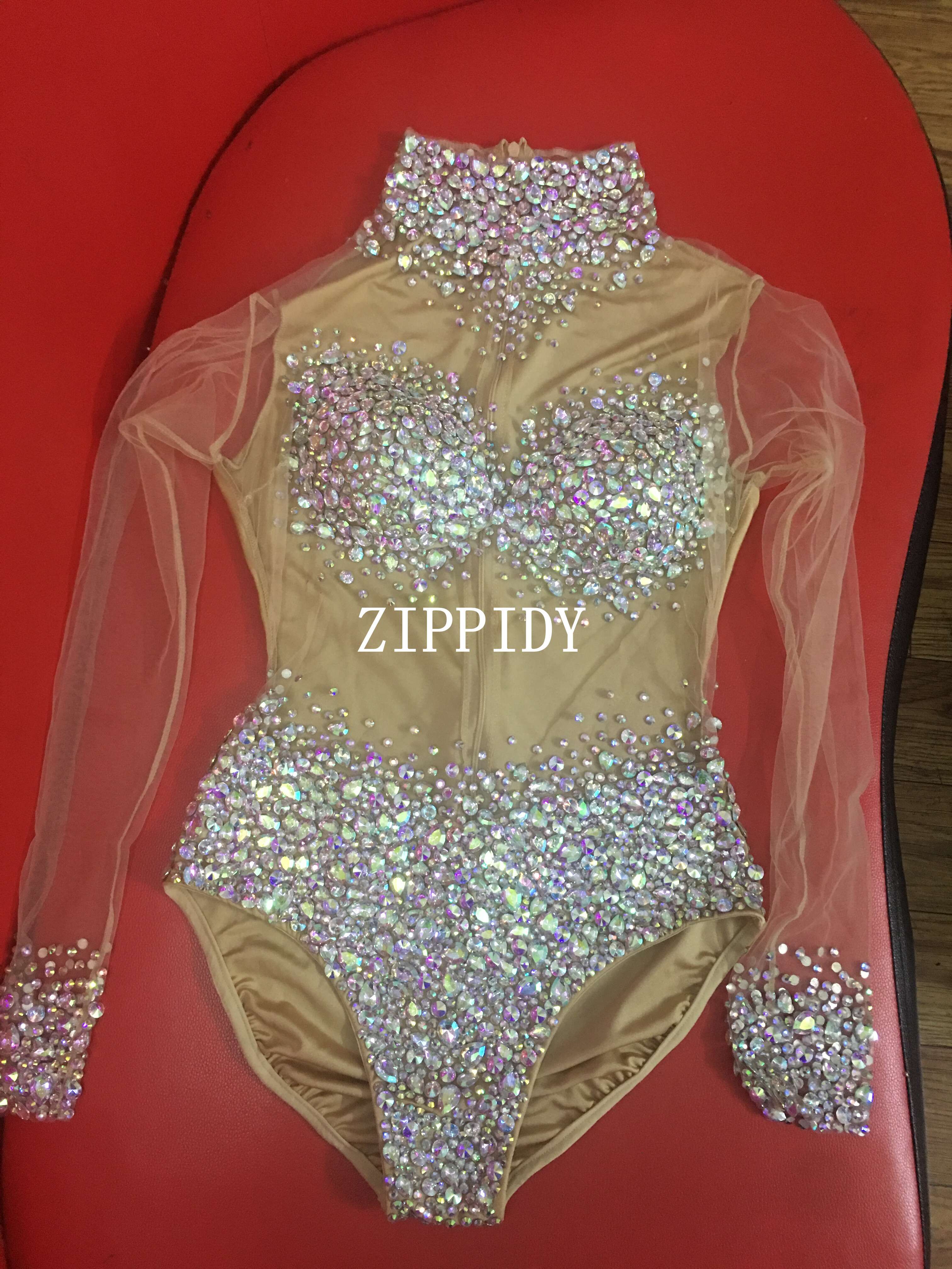 Sexy AB Rhinestones Mesh Bodysuit Birthday Celebrate Wear Female Singer Show Bodysuit Evening Prom Party Stage Wear