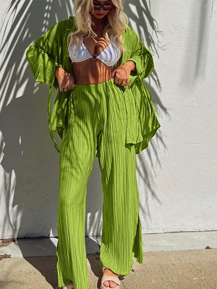 Spring Women's Shirt Pleated Two Piece Set Loose High Waist Wide Leg Pants Suit Casual Elegant Office Ladies Female Outfit