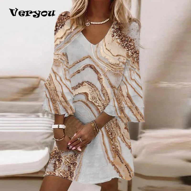 Summer Women Harajuku Print Vintage Shirt Dress Femme Elegant 3/4 Sleeve Loose Mini Dress Spring Sexy V Neck Party Dress