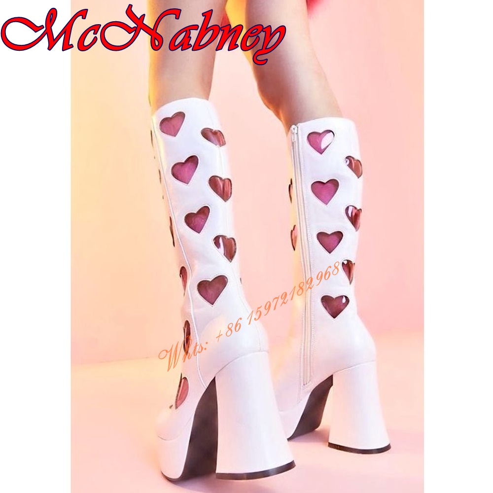 Product Name:Sweet Heart Patent Leather Boots Knee High Chunky High Heels Round Toe Women Runway Shoes Side Zipper Patchwork Spring Party