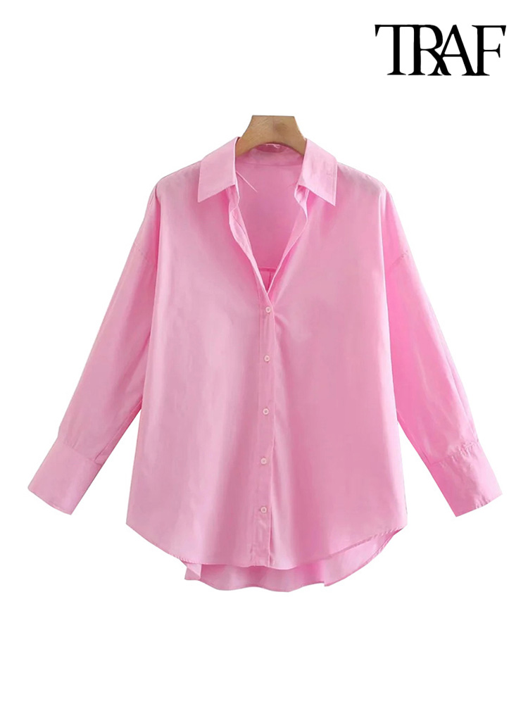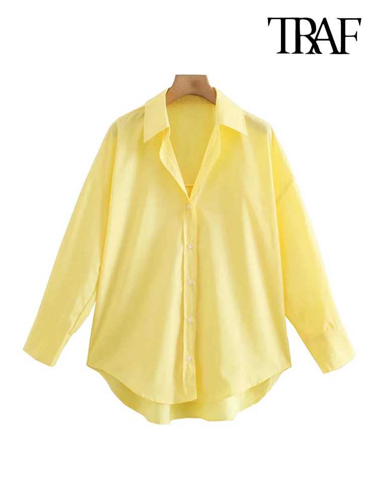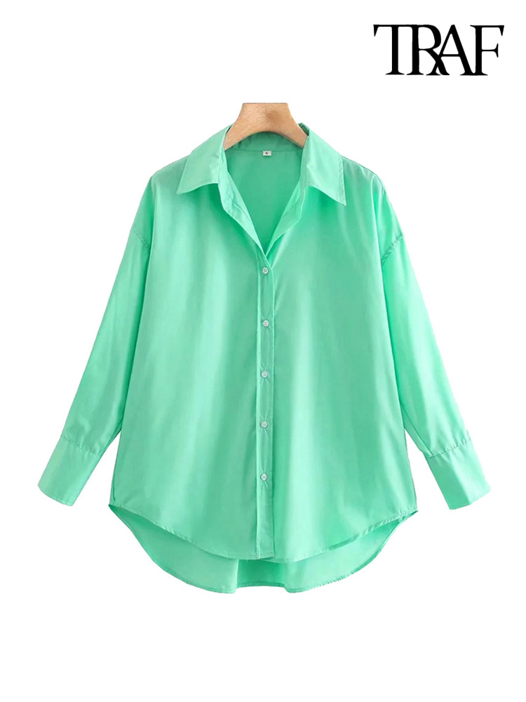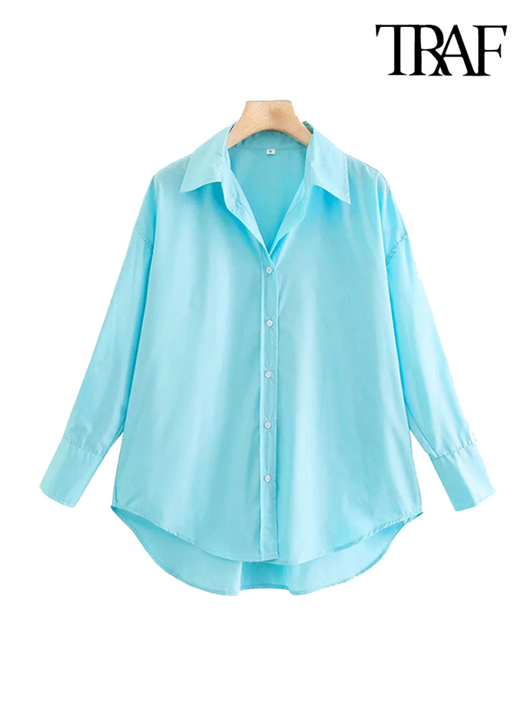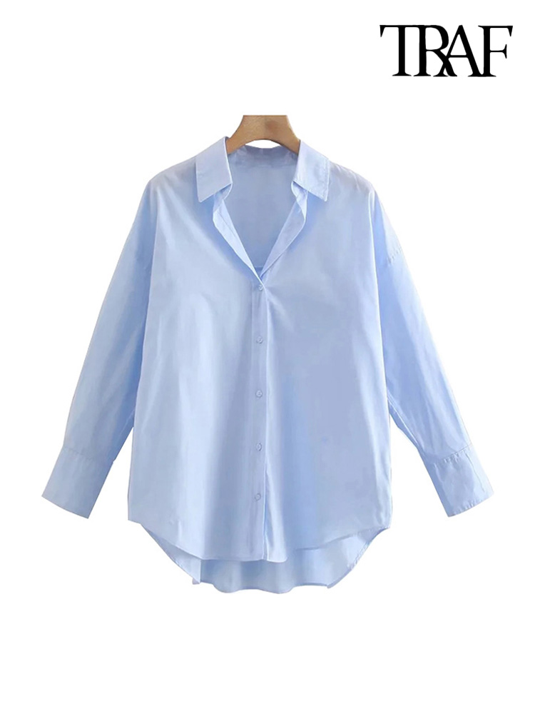 TRAF Women Loose Asymmetry Poplin Blouses Vintage Long Sleeve Button-up Female Shirts Blusas Chic Tops