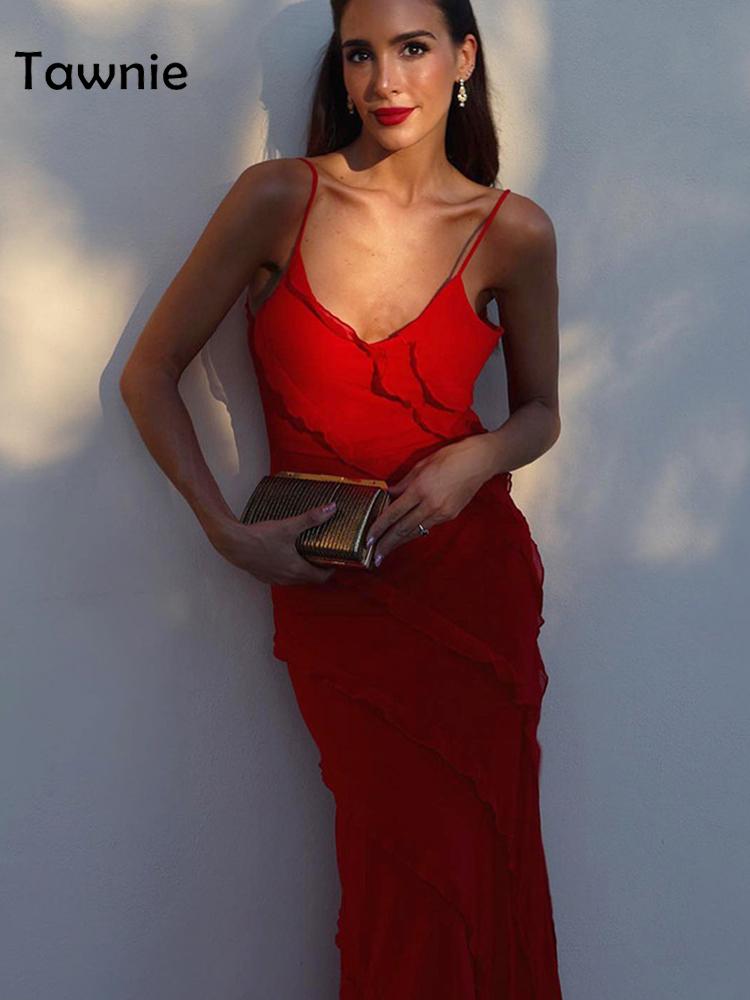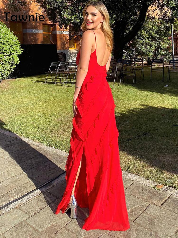 Tawnie Spaghetti Strap V Neck Maxi Dress Women Summer Elegant Ruffles Backless Sleeveless Bodycon Dresses Party Club Beach