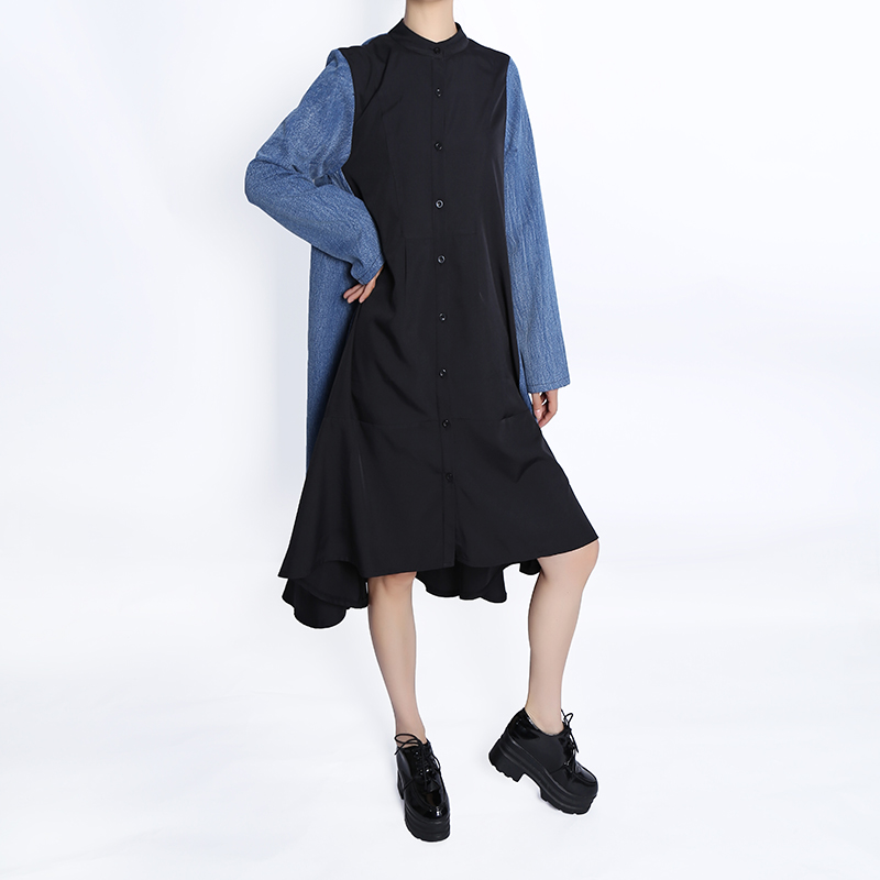 Very Big Size Woman Autumn Woman Long Sleeve Casual Wear Blue Black Denim Patchwork Dress Button Up Girls Unique Robe HU7728