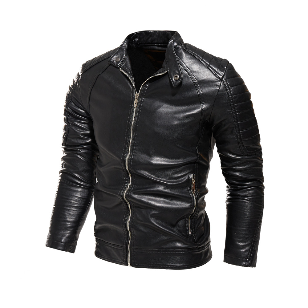 Winter Black Leather Jacket Men Fur Lined Warm Motorcycle Jacket Slim Street BLack Biker Coat Pleated Design Zipper