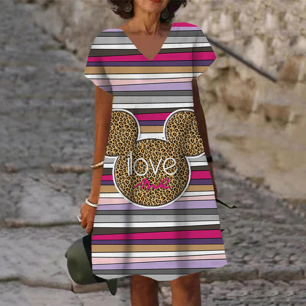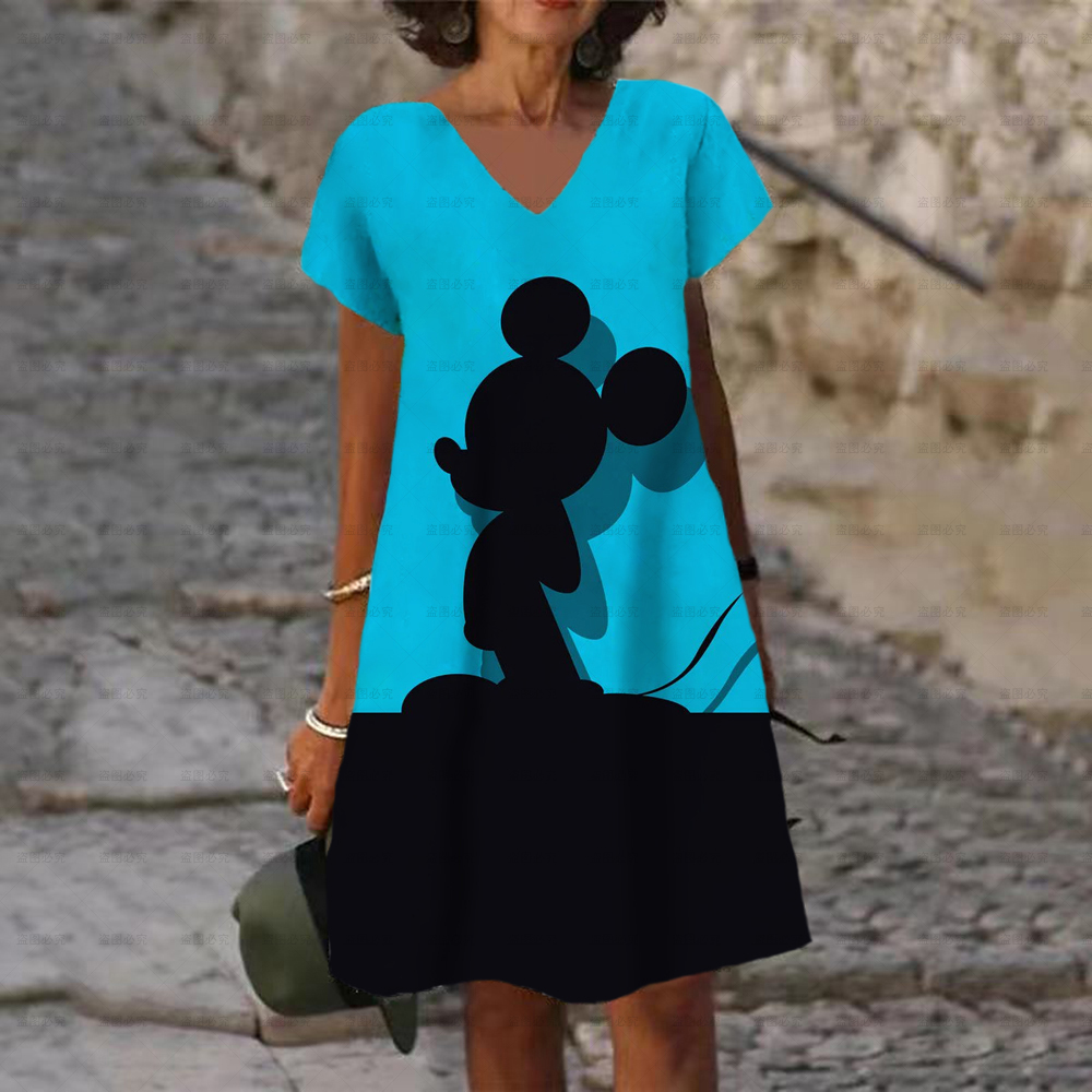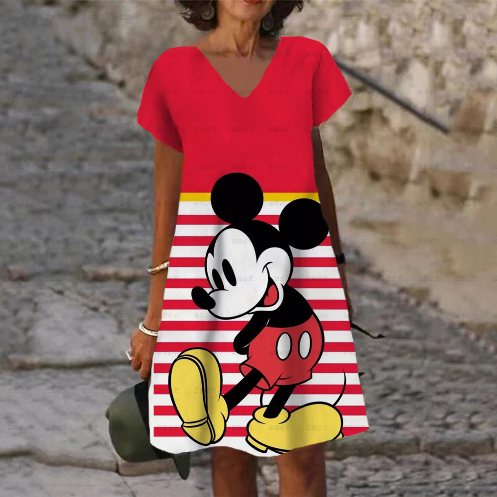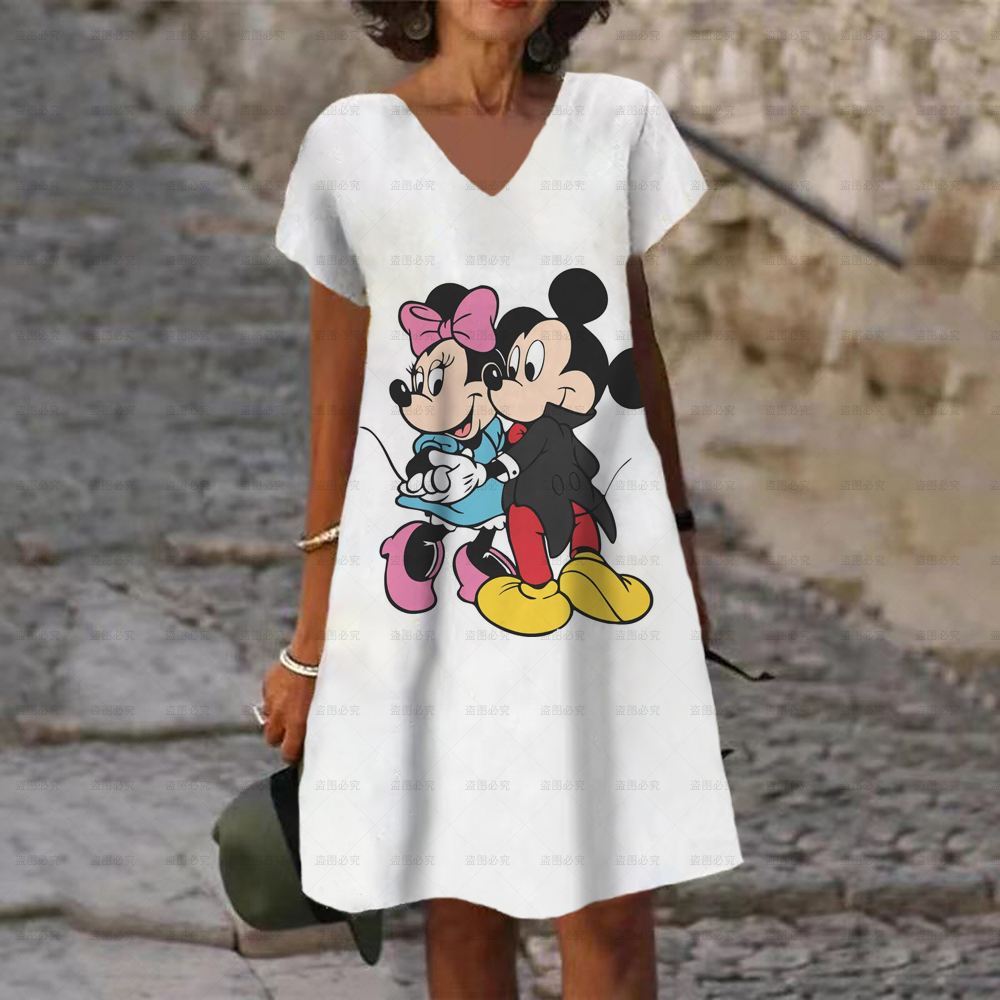 Women's Dress V Neck Casual Loose Dress Disney Mickey and Minnie Print Short Sleeve Knee Length Harajuku Dress