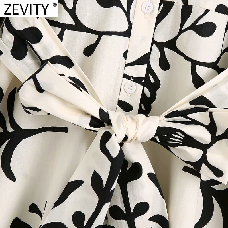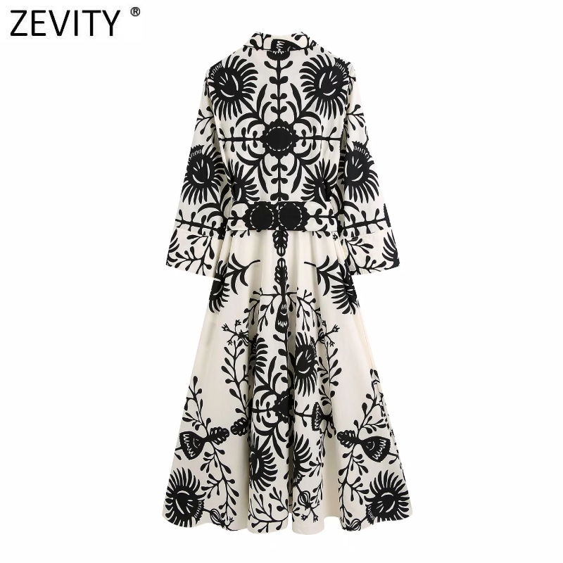 Zevity Women Vintage Black Totem Print Bow Sashes Shirt Dress Female Chic Three Quarter Sleeve Casual Slim Midi Vestidos DS8640