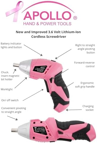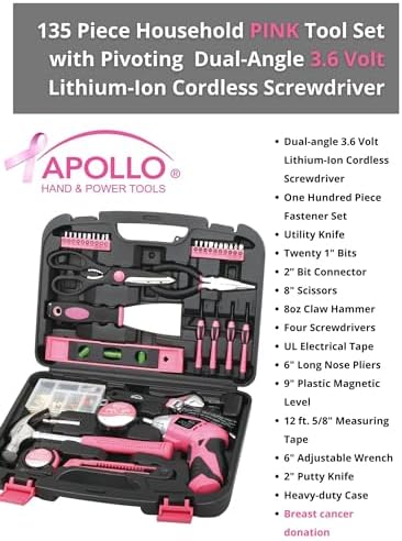 HOME DIY TOOL KIT: Whether you're hanging pictures in your new home or assembling a television stand in a dorm room, this kit puts everything you need for light- and medium-duty projects and repairs at your fingertips. This set includes tools carefully chosen for their usefulness in everyday household and DIY tasks so you will always have the right tool for the job. Tools are neatly stored in a sturdy case that keeps them secure, clean, organized, and easy to find. The case is easy to carry with its built-in handle; your tool kit can come with you wherever it is needed. THE UPGRADED 3.6 VOLT LITHIUM-ION RECHARGEABLE SCREWDRIVER packs a punch and is the perfect time-saving assistant. This powerful cordless screwdriver with forward/reverse mechanism allows for rapid tightening and loosening of screws. It features a bright LED to light up work areas. The power gauge lets you know when it’s time to recharge. CORDLESS SCREWDRIVER ANGLE ADJUSTMENT. For a more convenient reach depending on the situation, this cordless screwdriver's head has a useful pivoting feature. Push a button and the head rotates from straight to right angle. USEFUL HAND TOOLS: The set includes useful tools such as a claw hammer, adjustable wrench, long nose pliers and precision screwdrivers. It also comes with accessories to help you with your DIY and decorating tasks such as a putty knife for filling and smoothing holes and cracks in flat surfaces, a 100 piece wall hanging kit includes a wide assortment of pins, hooks and nails, a level and a tape measure will make sure the position and angle is perfect. Our hand tools are drop forged for strength; chrome plated to resist corrosion and have non-slip comfort grip handles for extra torque, and will last a lifetime under normal use. TOOL SETS ARE AN IDEAL GIFT IDEA and this particular set is a people pleaser. Tool sets make for a thoughtful housewarming gift, an original shower gift, a useful Christmas gift or graduation gift. Parents find it an empowering gift to give children as they leave the nest. Some of our customers are so happy with our pink tool set that they have given them as gifts time and time again. CANCER RESEARCH DONATION. A cause dear to our heart at Apollo Tools, we wanted a portion of every purchase to go directly to help breast cancer research. 1 dollar out of every purchase of this handy tool kit goes directly to benefit breast cancer research and cure. Contains: Dual-angle 3.6 Volt Lithium-Ion Cordless Screwdriver One Hundred Piece Fastener Set 18mm Utility Knife Ten 1" Bits CRV (1/8", 5/32", 3/16", 1/4", PH1, PH2, PH3, PZ1, PZ2, PZ3) Ten 1" Bits CRV (T10, T15, T20, T25, T27, T30, 1/8", 5/32", 3/16", 1/4") 2” Bit Connector 8" Scissors 8oz Claw Hammer Four Screwdrivers (Phillips No. 1, No. 0, Slotted 2.4mm, 3.0 mm) UL Electrical Tape 6" Long Nose Pliers 9" Plastic Magnetic Level 12 ft. 5/8" Measuring Tape 6" Adjustable Wrench 2" Putty Knife
