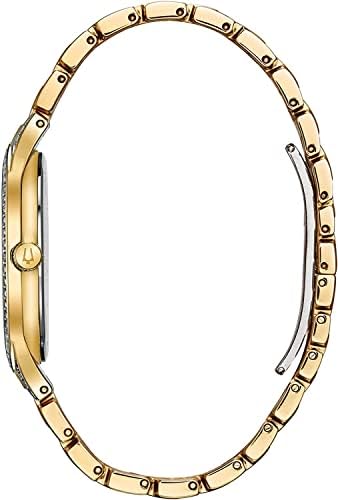 Slim and sleek style embellished with 440 Crystals. Gold and silver tone stainless steel case and bracelet and clear pavé dial. Watch features a flat mineral crystal, quartz movement, and water resistance to 30 meters.