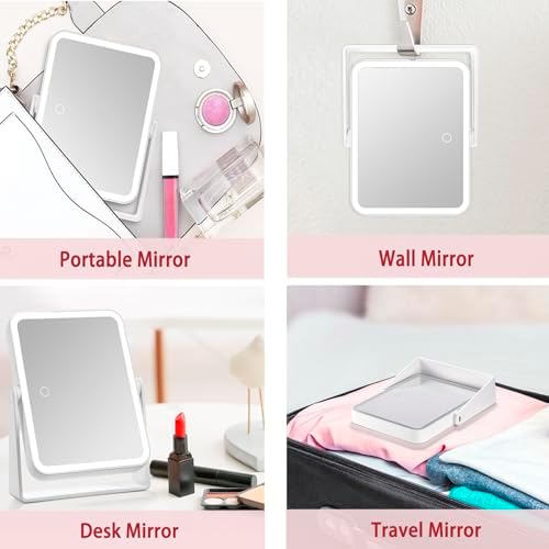 Rechargeable Travel Makeup Vanity Mirror with Lights and Magnification, Portable 10X/1X Magnifying Mirror with 3 Color Light, Lighted Makeup Mirror with Magnification, Desk LED Mirror, 360° Rotation