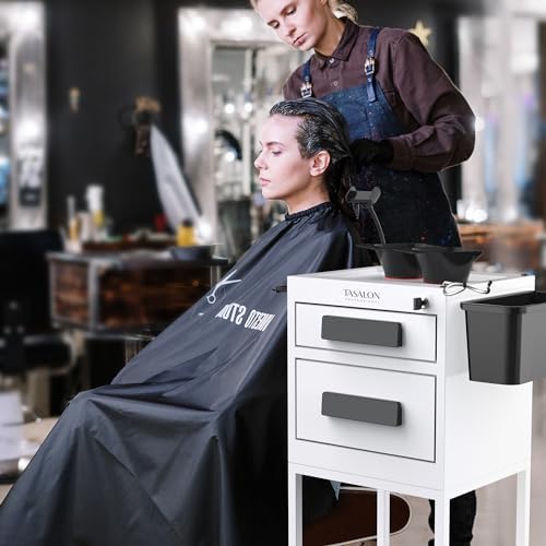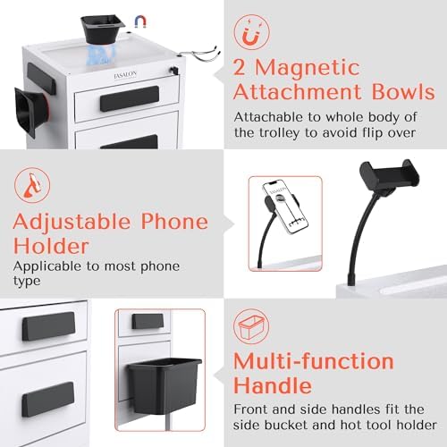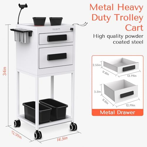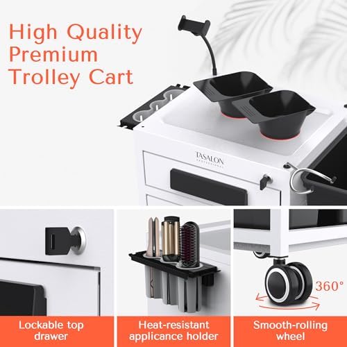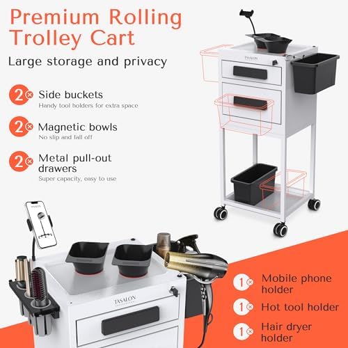 Now you don't have to settle for cheaply-made beauty salon furniture. The TASALON ultimate metal rolling trolley is here to take all the hassle out of storing your work equipments. Thanks to its 2 Upper metal drawersand 2 magnetic bowls, 1 mobile phone holder, 1 hair dryer holder. New upgrade in function includes 1 lockable drawer with keys, 3 hole heat-resistant hair dryer holder and 2 side plastic buckets that make your job easier.
