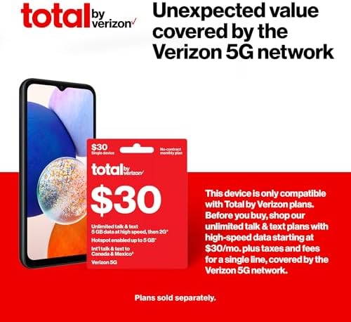 Keep up with life with your fast paced life with a phone that fits you, like the Samsung Galaxy A14 5G from Total by Verizon. Explore new wireless heights and see your favorite content come to life on large, edge-to-edge high definition screen. With the speed of 5G and a powerful Galaxy processor, you can experience you day virtually lag-free. Focus more on living and less on charging with long-lasting battery life. Upgrade your selfie game with a sharp 13MP front-camera, plus a triple-lens back-camera system that makes capturing high-res content a breeze. The Samsung Galaxy A14 5G has 64 GB storage expandable to 1T perfect for keeping all your favorite memories, content, and more all in one place.Get a premium wireless experience without the premium price tag or costly long-term contracts with high-speed data and Unlimited talk & text plans from Total by Verizon that start at just $30/mo plus taxes and fees for a single line. 5G access requires a 5G-capable device in a 5G coverage area.