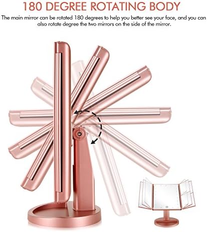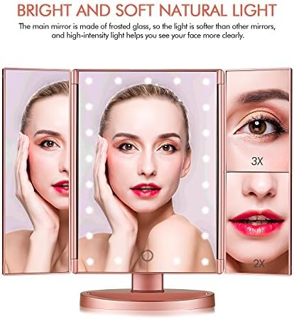 Tri-fold Lighted Vanity Makeup Mirror with 3x/2x Magnification,21 LEDs Light and Touch Screen,180 Degree Free Rotation Countertop Cosmetic Mirror,Travel (Rose Gold)