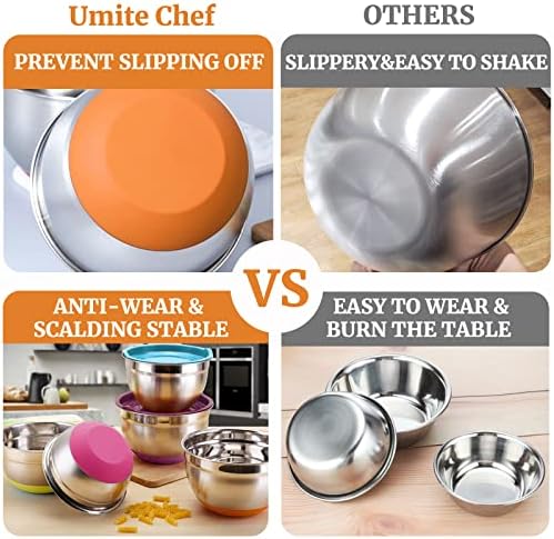Umite Chef bowl set is made of high quality, heavy weight stainless steel that ensures safety and durability. They are rust-resistant, sturdy structure and durable for daily use. Airtight lids fit each bowl size, you will never worry lid will warp or shaped