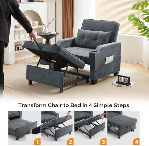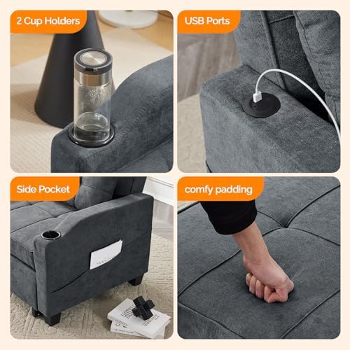 VINGLI Convertible Sleeper Chair 3-in-1 Sofa Bed, Pull Out Couch Sleeper Sofa Recliner with Adjustable Backrest, USB Ports, Cup Holders, Side Pockets for Small Space Living Room, Bedroom