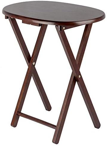 Make entertaining simple and easy with the Winsome Wood Nathan 5-Piece Snack Table Set. This versatile set includes four tables and for convenience a storage rack to store your tables out of the way when not in use. The oval shape of these snack tables makes these distinctive and stylish. Ideal for setting out appetizers at a party, enjoying a meal while relaxing on the sofa, or for working on your laptop. This set of foldable tables open up to X-frame bases which make these table not only look good but also help with stability. Tables easily open up, with a wood stopper on the other end helping the legs stay standing. Great for daily use and compact enough to store in the closet. Constructed of solid wood, the rich cappuccino finish brings out the warmth of the wood grain. Conveniently packed and shipped in 1 box. Tables arrive ready to use and require no assembly. Minimal assembly is required for stand. Replacement part request can be submitted directly to the manufacturer within 60 days from date of purchase. Individual Table Size: 20.7"W x 15.8"D x 25.5"H (open) Individual Table Size (closed): 20.7"W x 2"D x 29"H Dimensions of Stand with tables stored: 23.7"W x 12.9"D x 31.3"H Static Maximum Weight per Table: 25 lbs. Tables come fully assembled Storage Stand requires assembly Ships in 1 box
