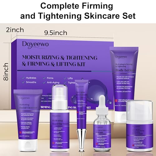 - Our skincare routine kit provides everything needed for younger-looking skin, including a facial cleanser, toner, eye cream, serum,face cream and body & neck lotion. The cleanser and toner gently cleanse and hydrate while restoring the skin barrier. The face cream, serum, eye cream, and neck lotion work together to hydrate,moisturize,anti-aging,firm,tighten,improving elasticity and enhance skin tone. Infused with premium ingredients like retinol, sodium hyaluronate, vitamin E, and glycerin, the products are cruelty-free and sulfate-free, suitable for all skin types, including sensitive skin