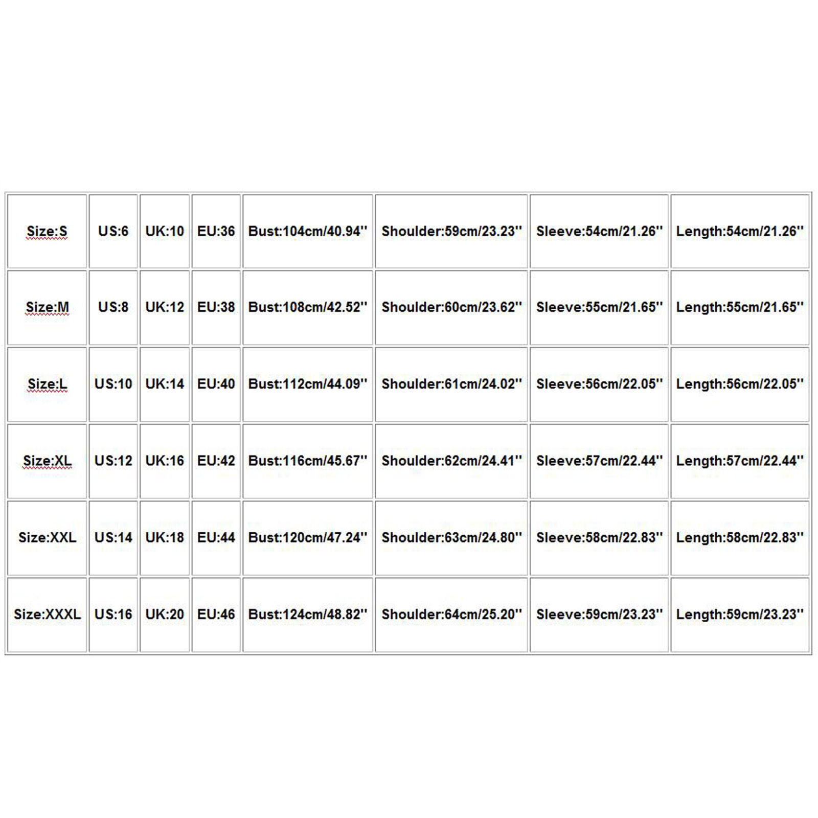 Size US UK EU Bust Shoulder Sleeve Length