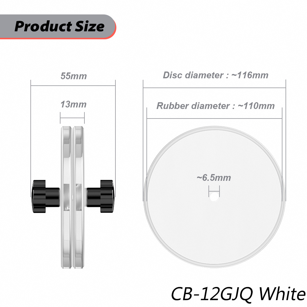 CB-12 or CB-07 is clean so you can see your label is dry!!! It's fit for 12 inchs LPs or 7 inch EPs.Label is sealed with rubber o-rings in an airtight chamber. Includes industrial quality handles. Industrial handles enable a SECURE GRIP, suspending the record and allow cleaning records without touching the vinyl! The Clear Choice For Cleaner Sound.Records will have cleaner sound and your stylus will last longer. Spray on your preferred cleansing solution and RINSE DIRT off the vinyl as you clean... Don't work it around the record! (You risk groove damage).