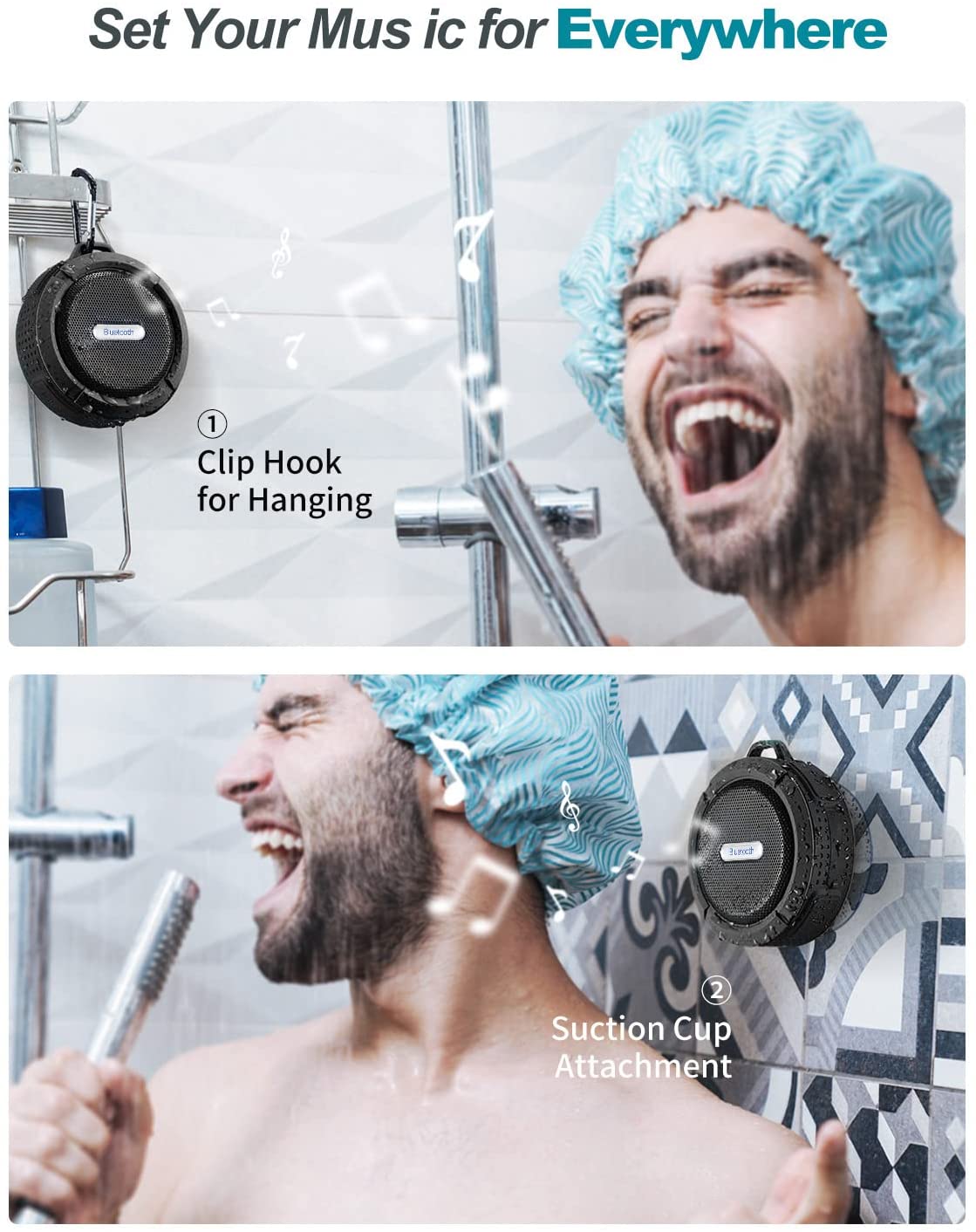 Portable & Lightweight - Equipped with a suction cup and the detachable metal hook, it is easy to attach in shower wall, tiles and mirrors, and you can also use the hook to hang the portable speaker on the backpack when hiking.