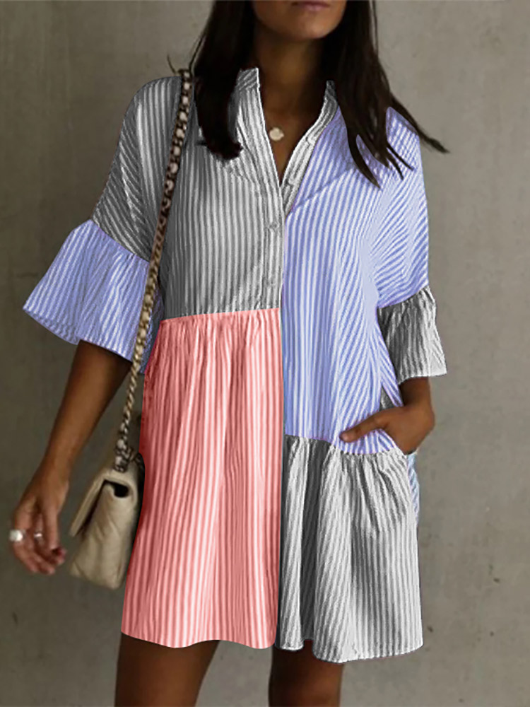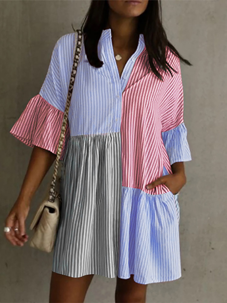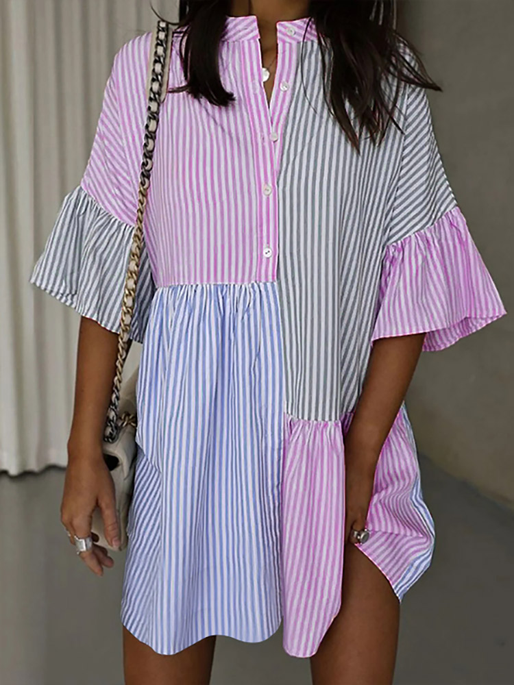 Celmia Stripe Patchwork Flare Half Sleeve Mini Dress Summer Elegant Casual Loose Buttons Short Sundress Women Shirt Dress