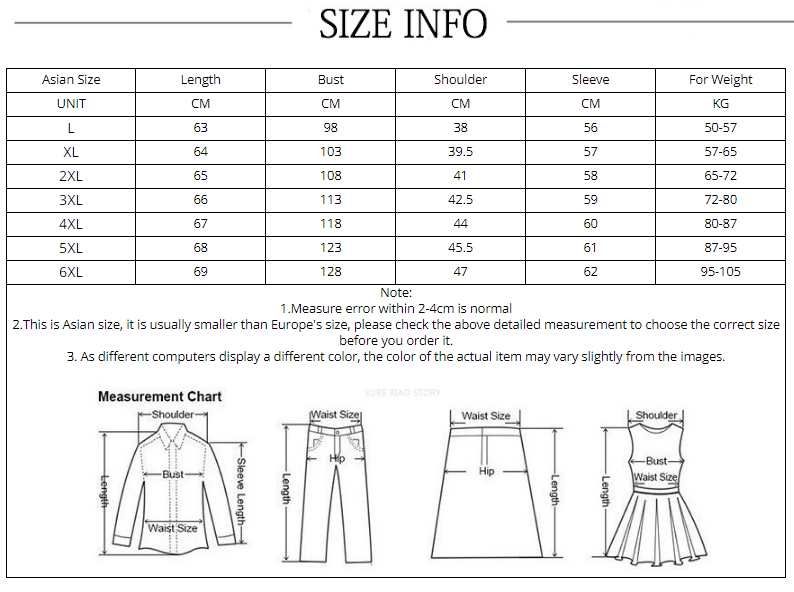 | Note: 1.Measure error within 2-4cm is normal 2.This is Asian size, it is usually smaller than Europe's size, please check the above detailed measurement to choose the correct size before you order it. 3. As different computers display a different color, the color of the actual item may vary slightly from the images.