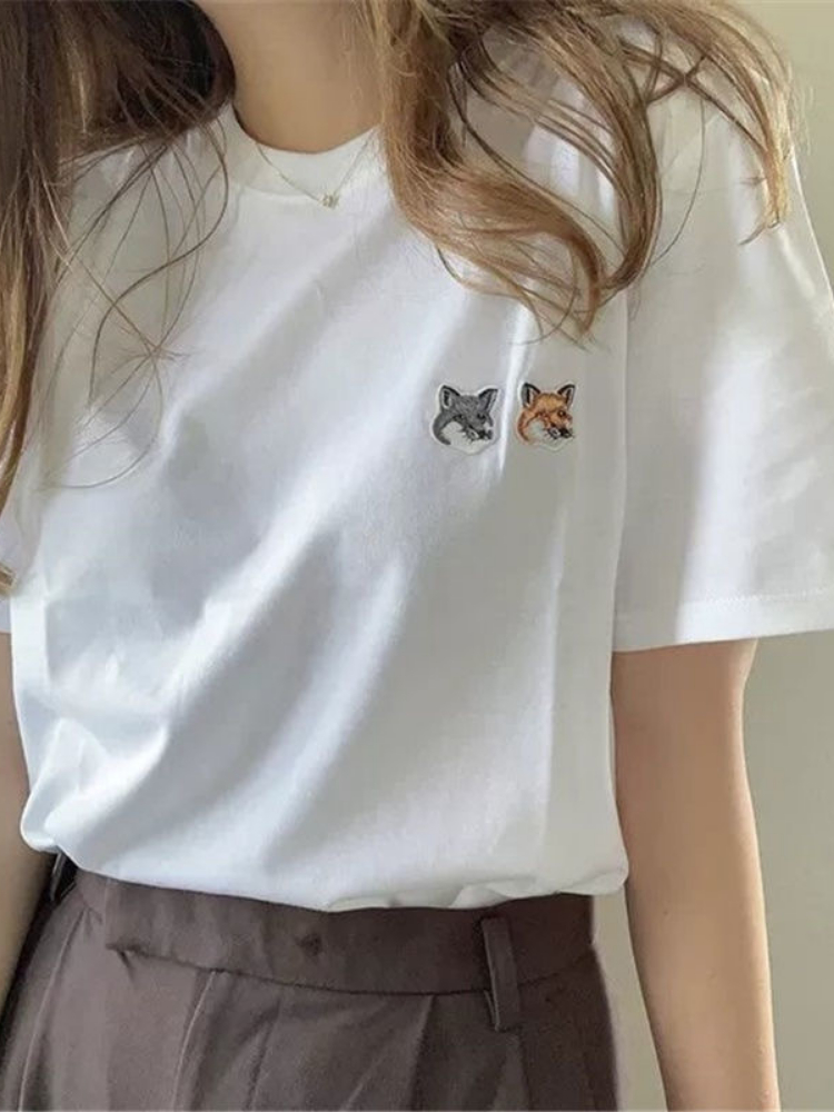 Classic Couple Crop Top T-shirt Double Fox Head Graphic Womens Pure Cotton Summer Casual All-match Short Sleeve PlusSize