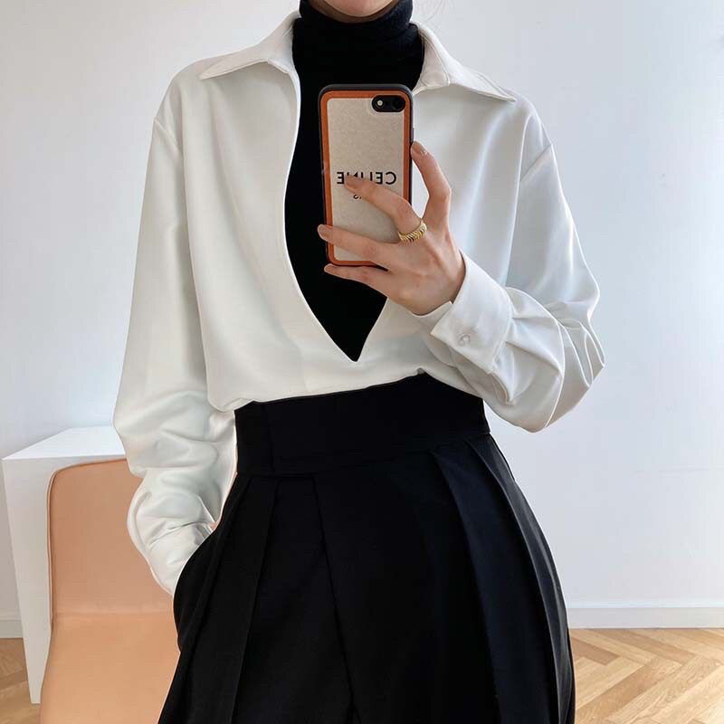 Deeptown Vintage Women Blouses White Female Office Wear Shirt Oversized V Neck Long Sleeve Ladies Tops Basic Chic