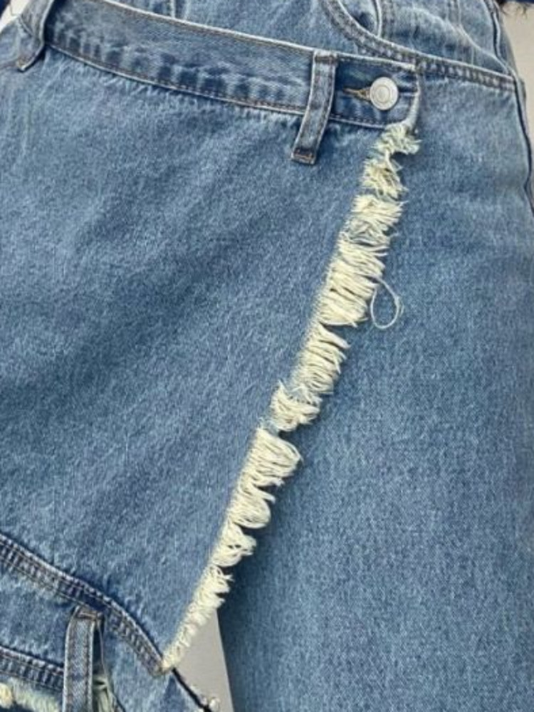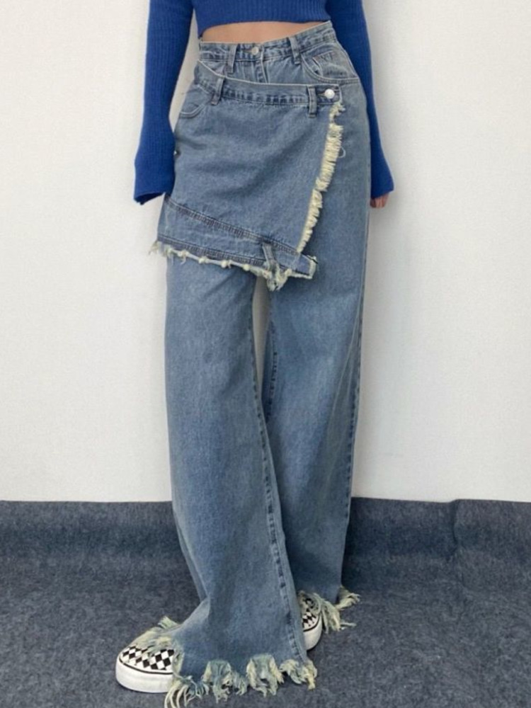 [EWQ] Style Retro Fake Two-piece Stitching Jeans Irregular Frayed Hakama Design High Waist Pants Autumn 16Y355