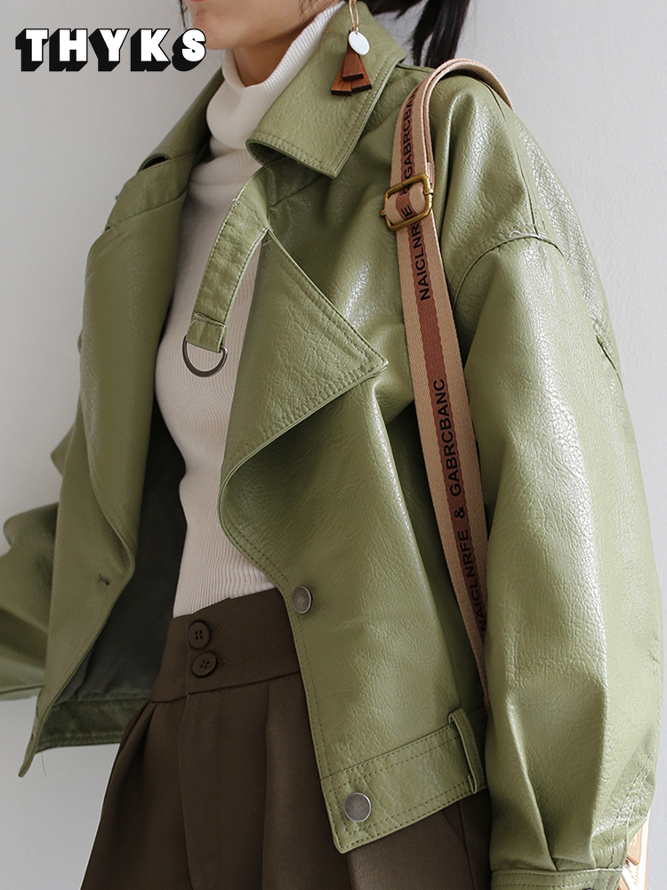 Fall Fashion Green Soft Faux Leather Jacket Ladies Pocket Loose Biker Cropped Jacket High Quality Designer Clothing 2022