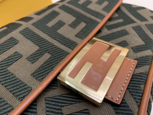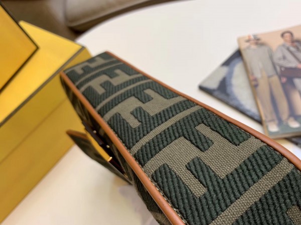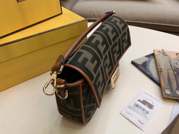 Iconic Baguette bag in medium size, with flap and FF fastening with magnetic clasp. Lining with zip pocket. Can be carried by hand or worn cross-body thanks to the detachable shoulder strap. Made of blue denim with embroidered FF motif. Finished with natural-colour leather details. Pequin webbing shoulder strap.