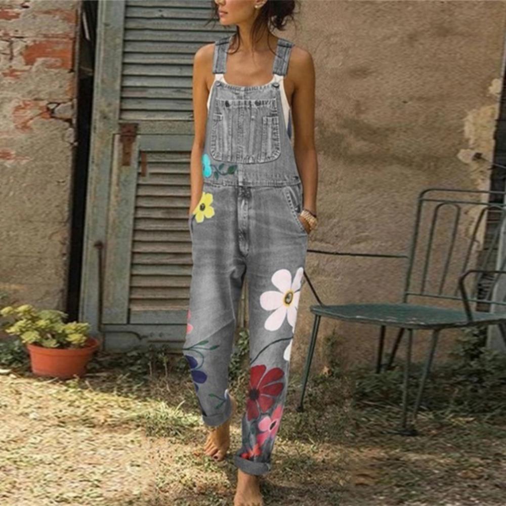 Floral Print Loose Danim Overalls for Women Summer Blue Denim Overalls Jumpsuit Rompers Femme Ninth Pants Female Pants