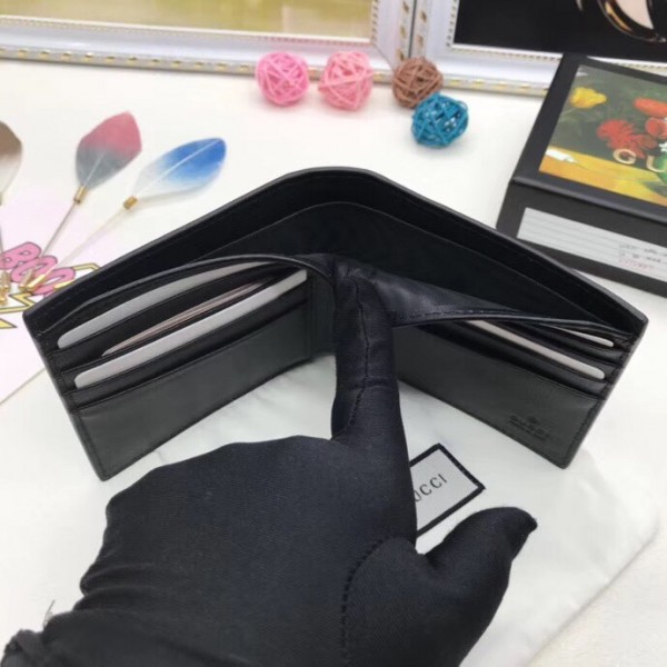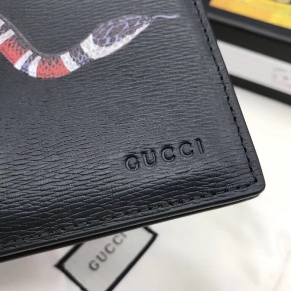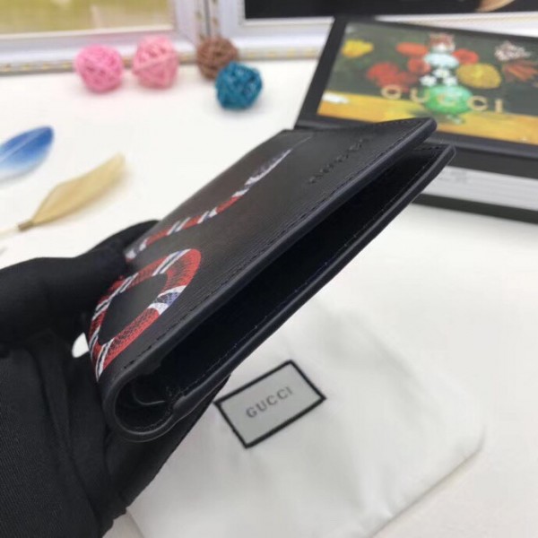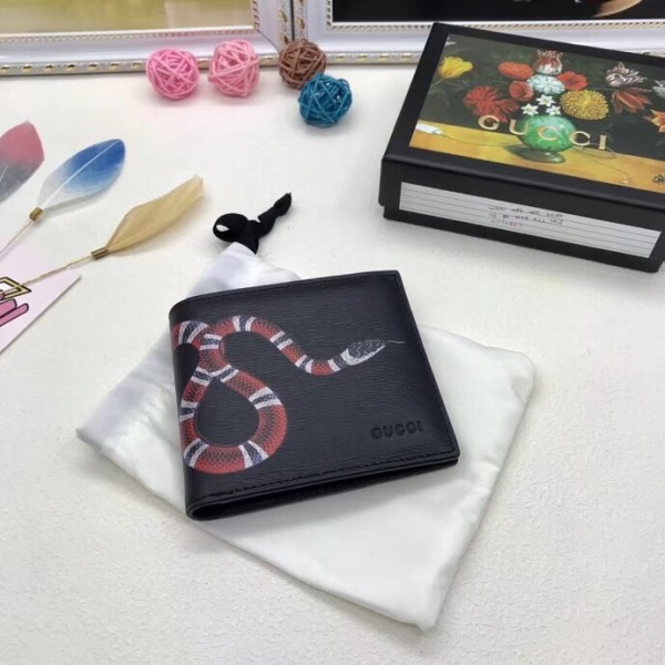 The Kingsnake, thought to symbolize wisdom and power, emerges as one of the signature details of Alessandro Michele’s collections. Here, it is printed across a bi-fold wallet made in black leather.