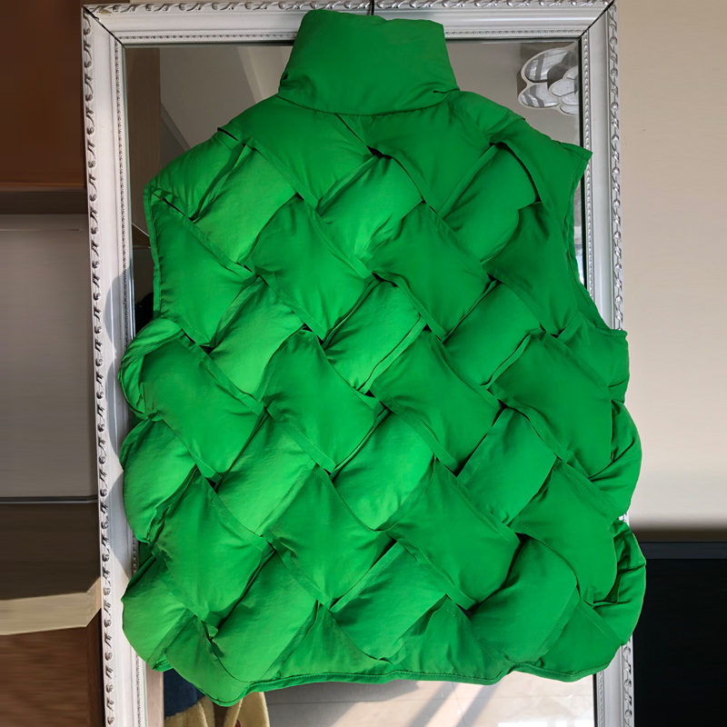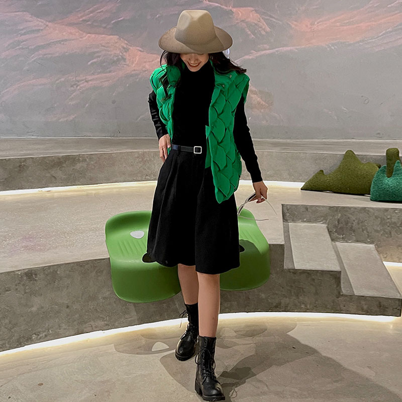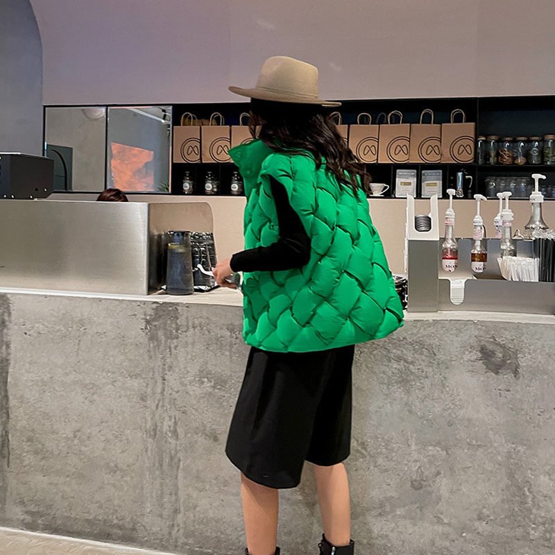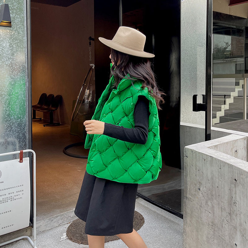High street Knitted Sleeveless Vest Autumn Winter Green Stand collar Puffer jacket Loose Outerwear Warm INKEO 1O197