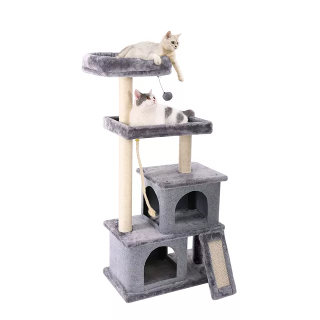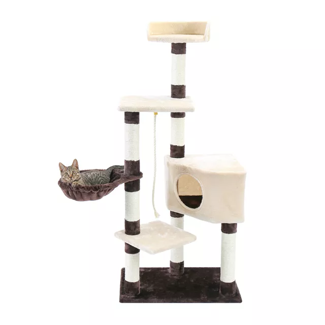 • MULTILEVEL FUN: The 5 level platforms design provide different jumping heights for your cats to satisfy their daily exercise. Two roomy condos are super comfortable for your pet to roll, with lateral door and round holes are designed for cats to observe outdoor as well as allowing them to get in and out or jump to the top hammock. A cozy perch on the top not only allow your cat to have a nice rest, but also offer a best spot to enjoy sunshine and outside scenery.