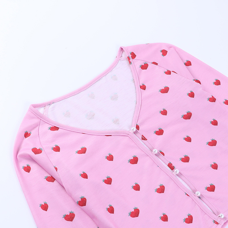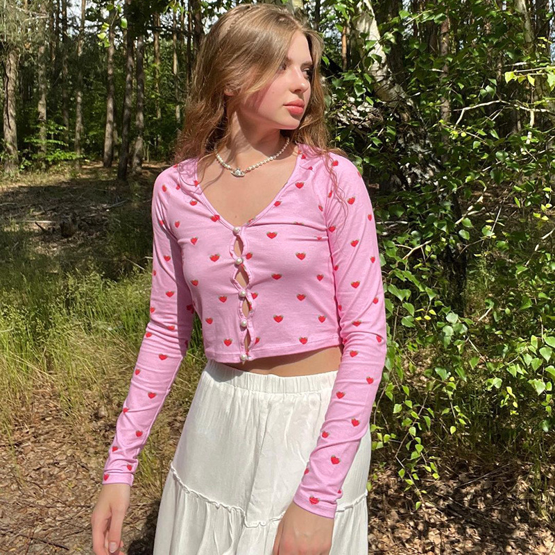 Pink Crop Tops V Neck Full Sleeve Hollow Out Strawberry Print Solid Pearl Buckle Short Cute T-Shirts Women Female Summer Autumn